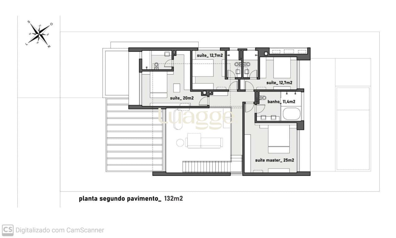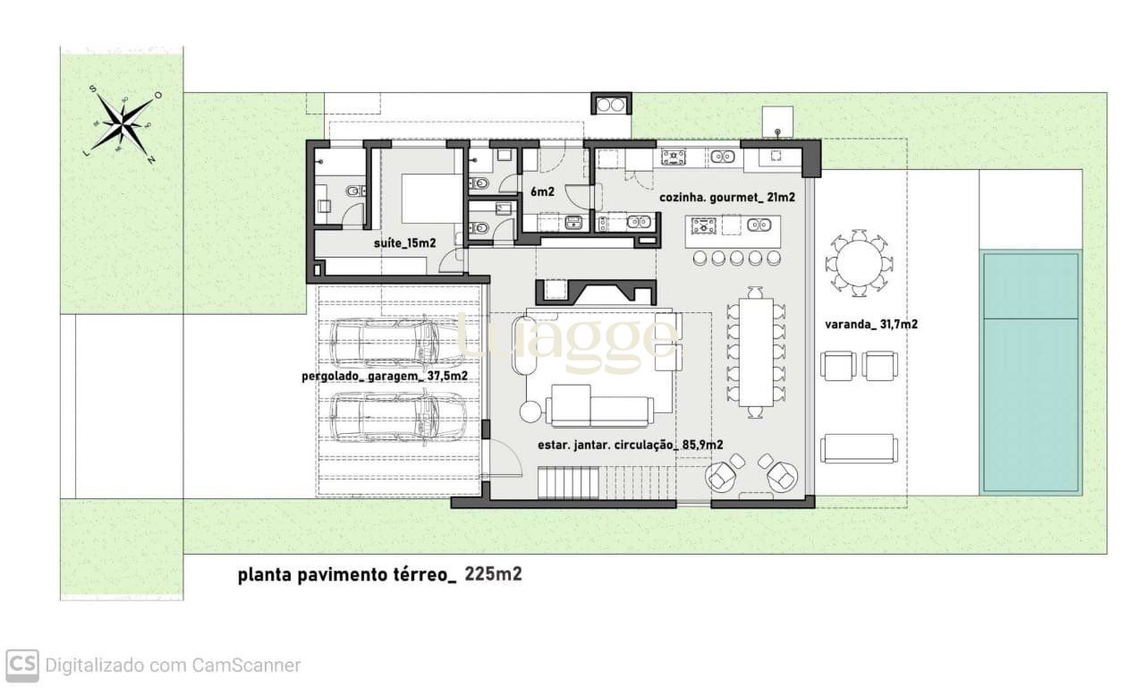 A casa possui 5 suítes, sala de jantar e estar, cozinha gourmet, área externa com piscina, estacionamento. Pavimento térreo com 225m² e o segundo pavimento com 132m².