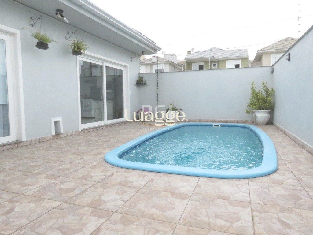 casa 3 dormitórios sendo 2 suite, , sala amola com rebaixo em gesso e lareira, cozinha grande com churrasqueira, 3 banheiros,, garagem fechada e automatizada para 2 carros, portão automatizado e cerca elétrica, água quente através de aquecimento solar, piscina quente solar.