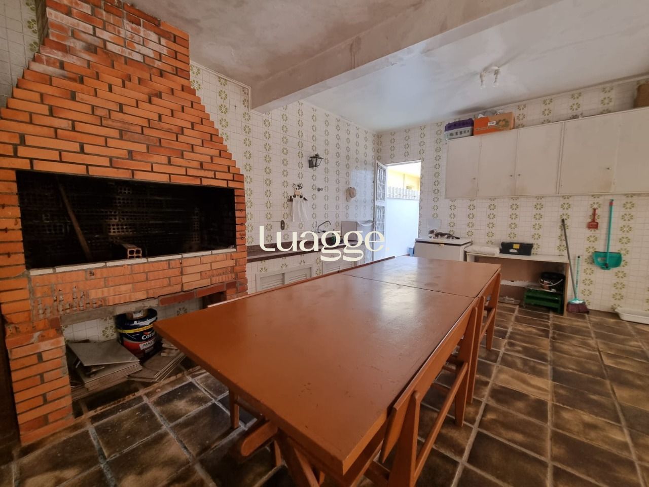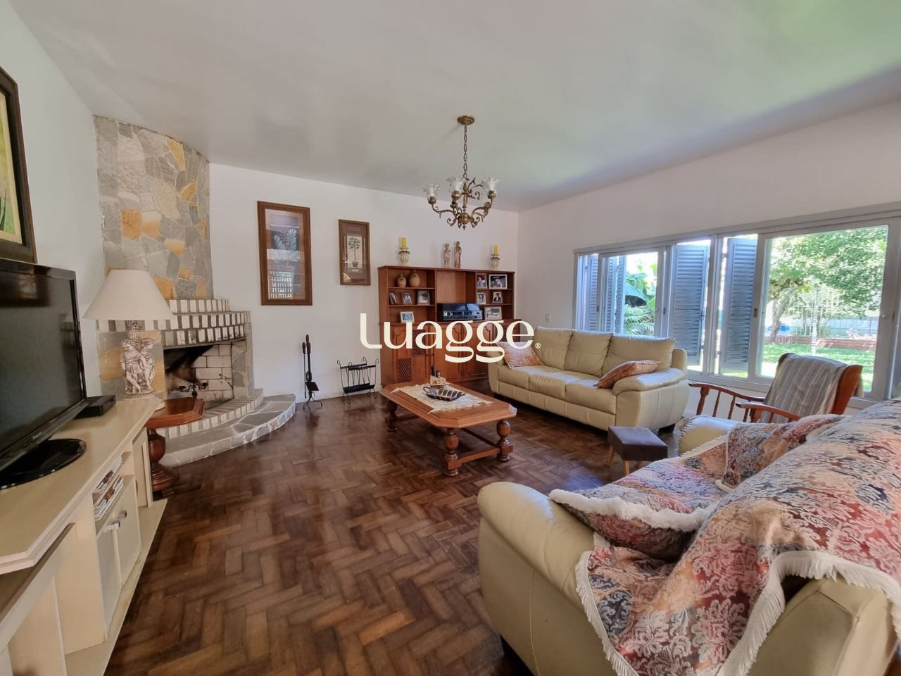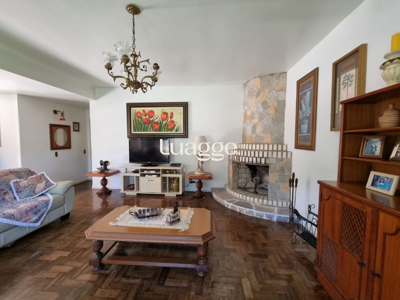 Possui living para 02 ambientes com lareira e lavabo, cozinha ampla com despensa, quarto no térreo, garagem coberta para 02 carros, churrasqueira e pequeno pátio nos fundos.