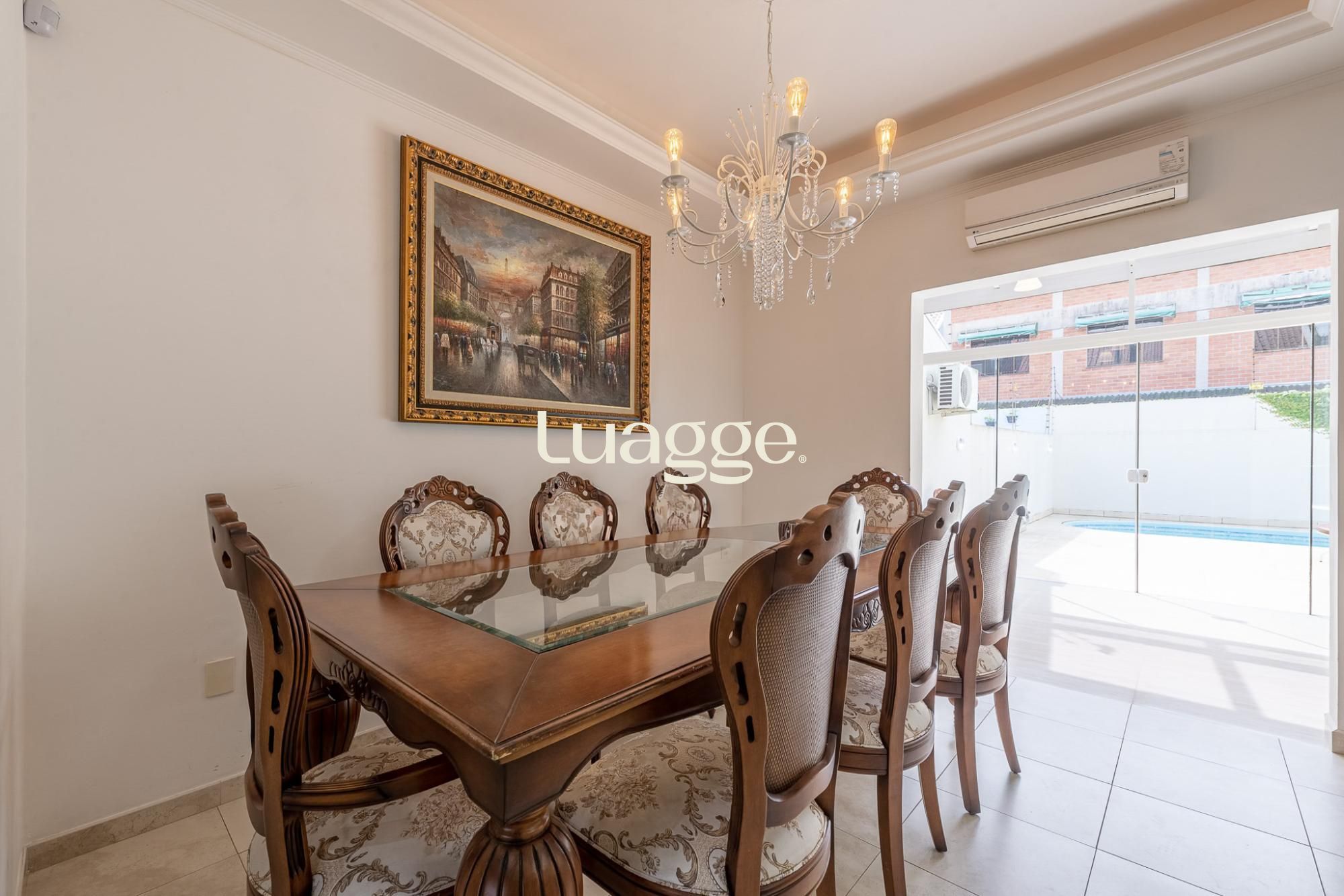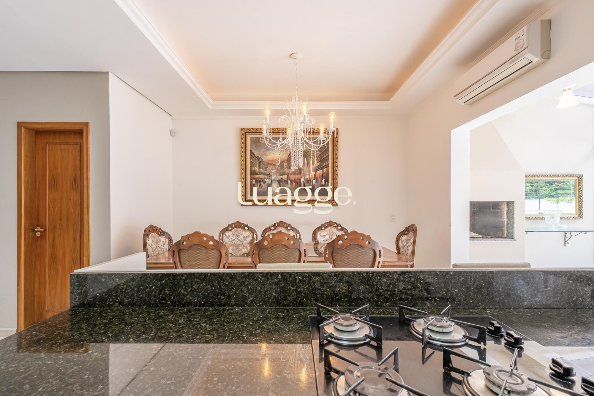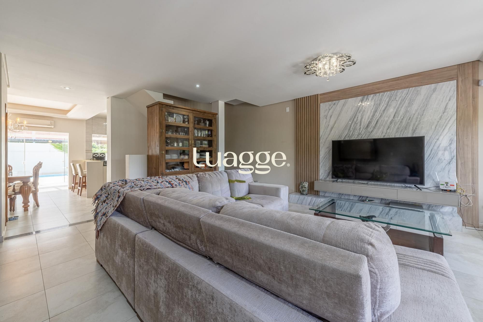 O primeiro pavimento oferece living para 2 ambientes com lareira, lavabo, cozinha americana planejada com sala de jantar e churrasqueira. Pátio amplo com jardim e piscina.