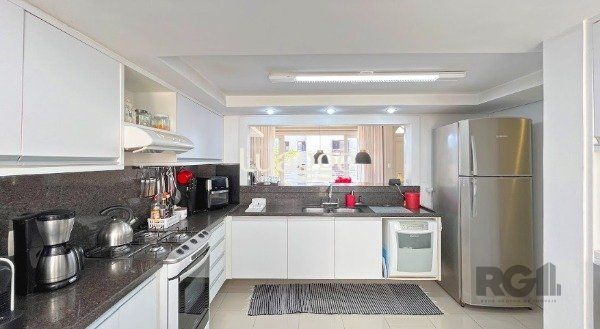 - Cozinha americana integrada à sala de jantar, equipada com móveis sob medida de alto padrão e revestimento em porcelanato, unindo praticidade e sofisticação;