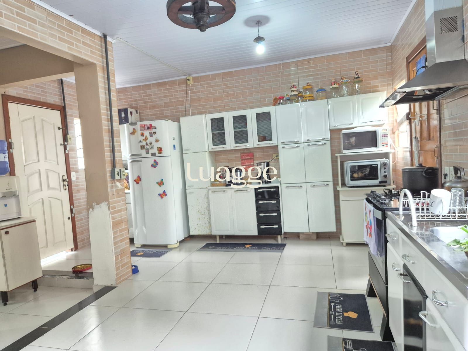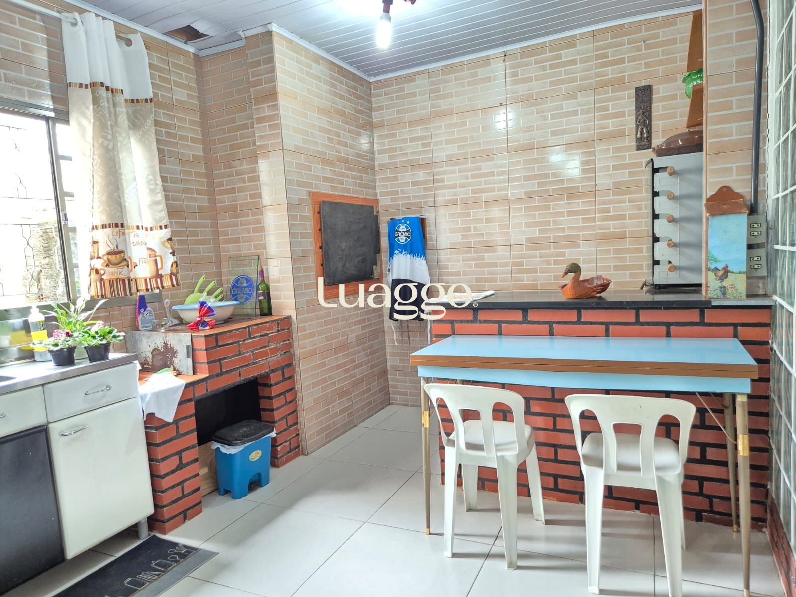 Ampla cozinha com churrasqueira e forno a lenha.