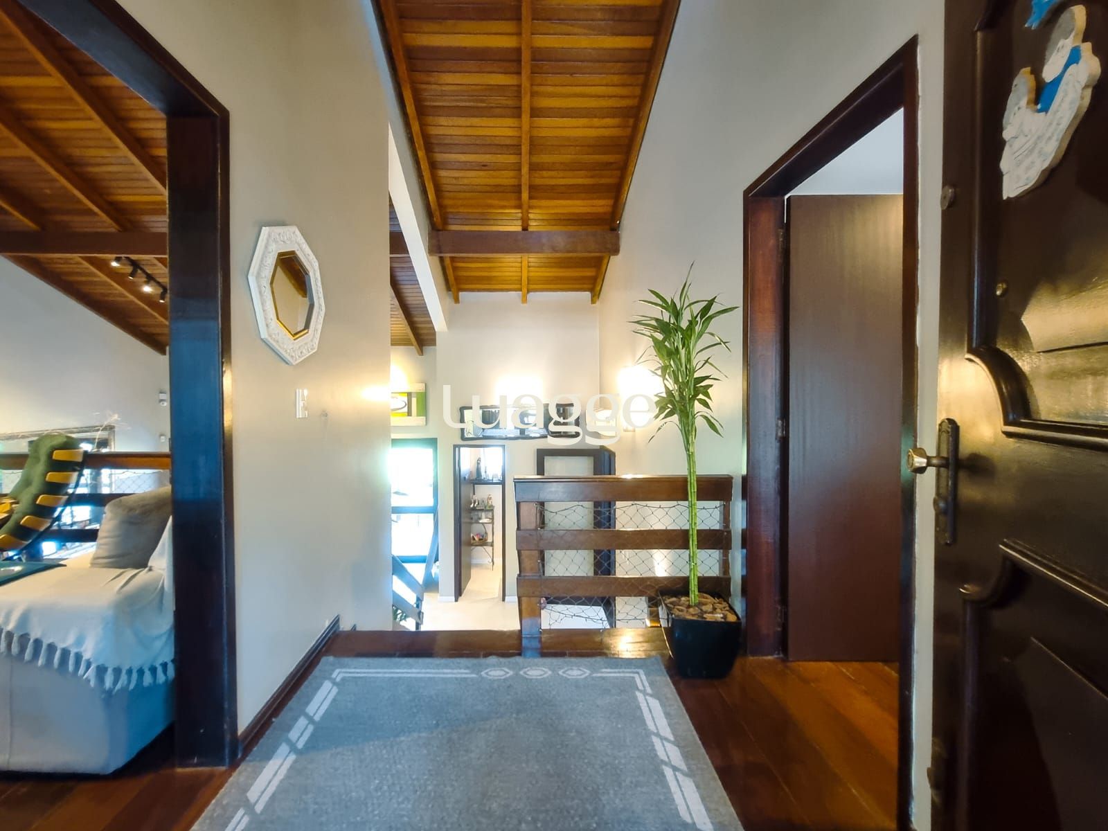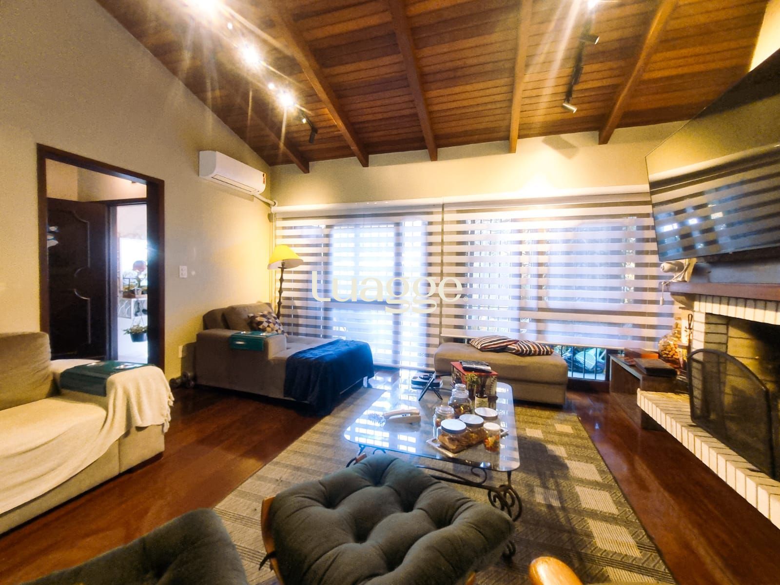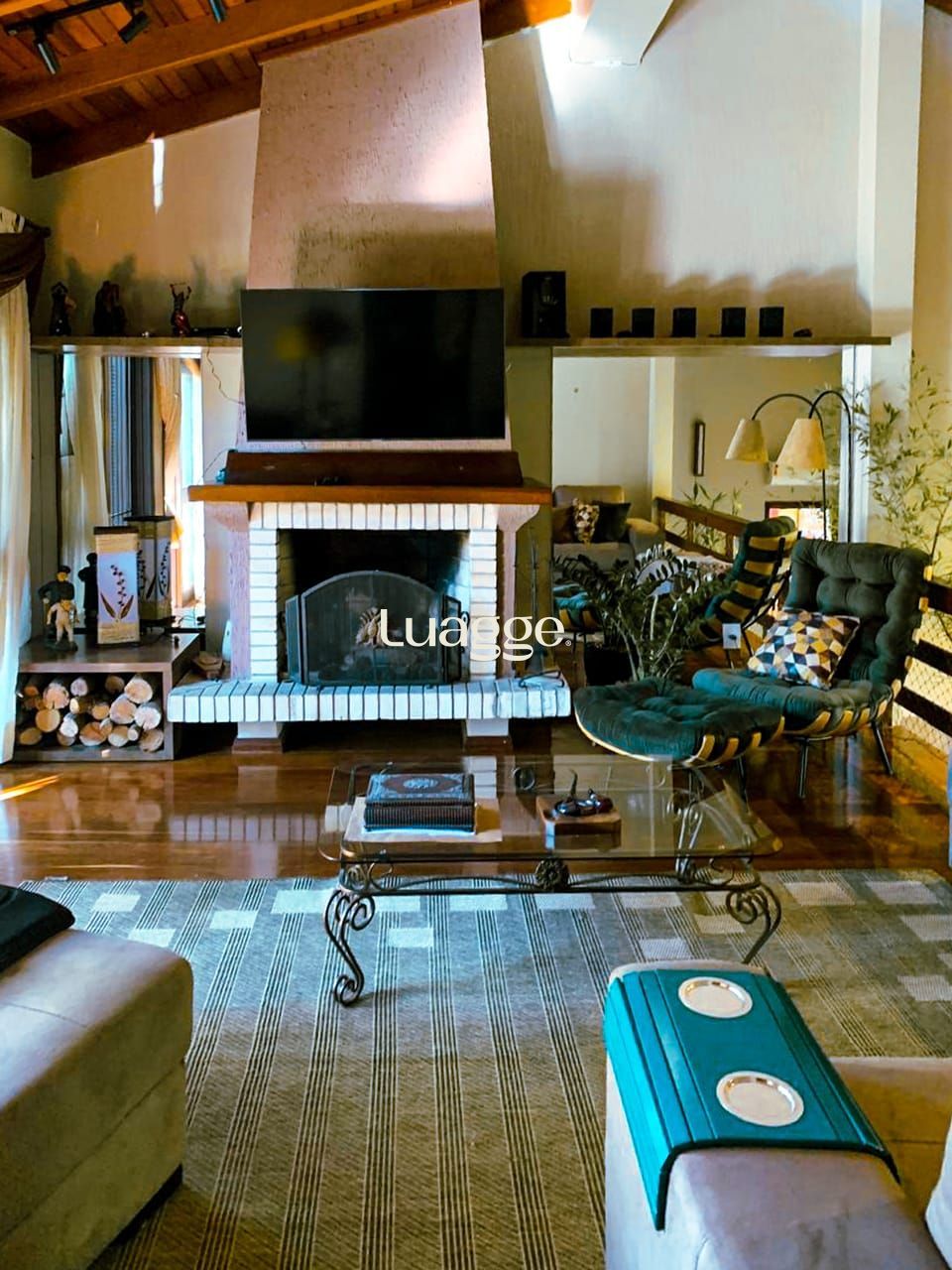 A sala de estar principal conta com pé direito elevado e um charmoso mezanino, que oferece vista para uma segunda sala com varanda envidraçada, permitindo apreciar o visual completo do morro com muita luminosidade natural.