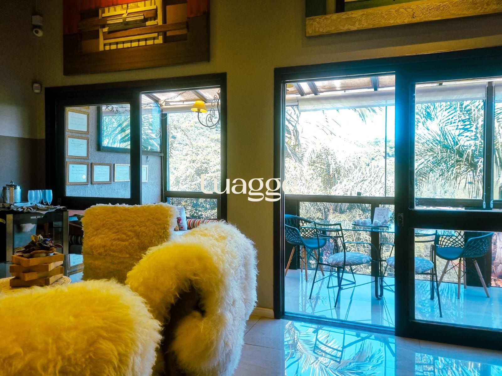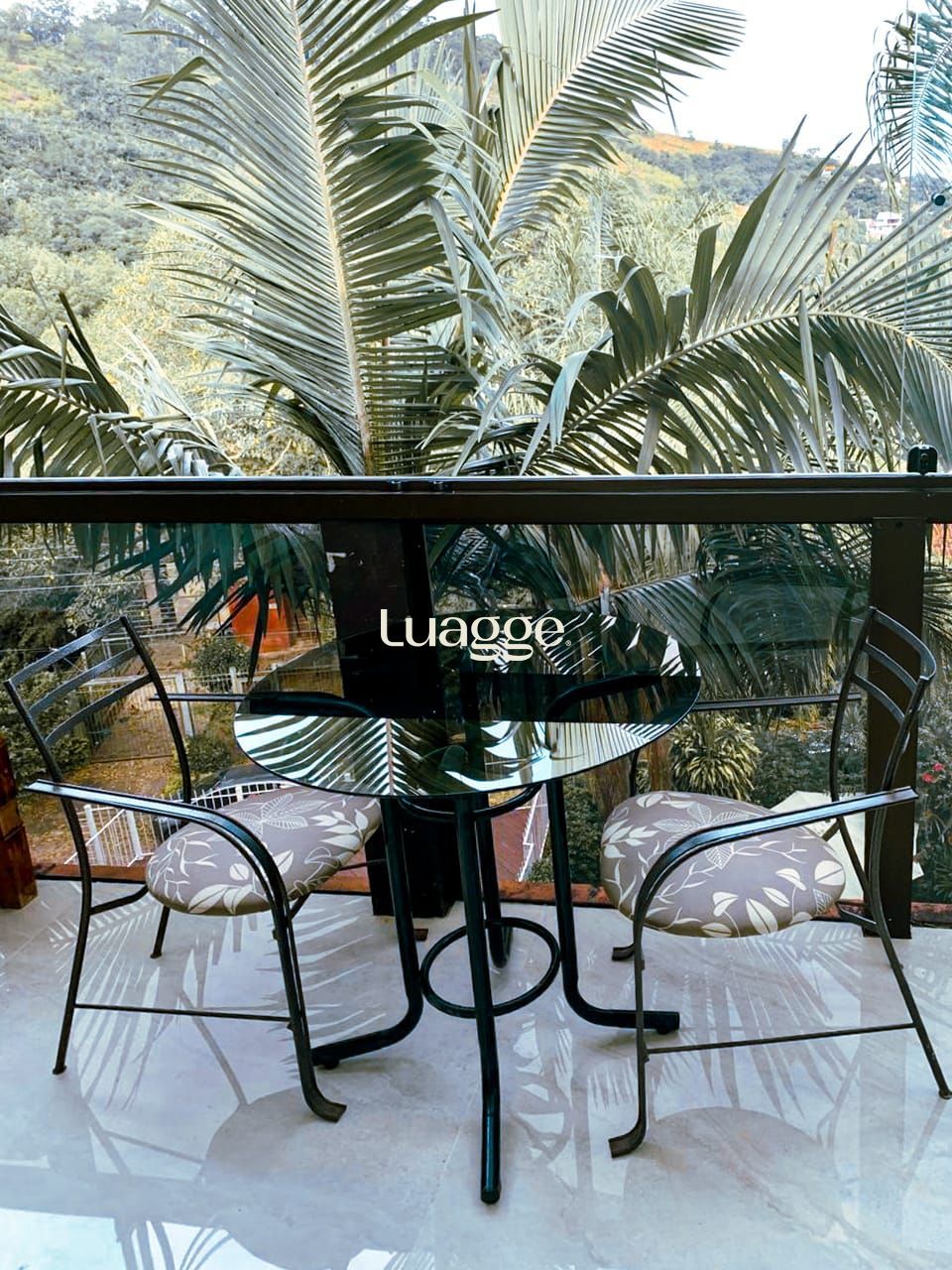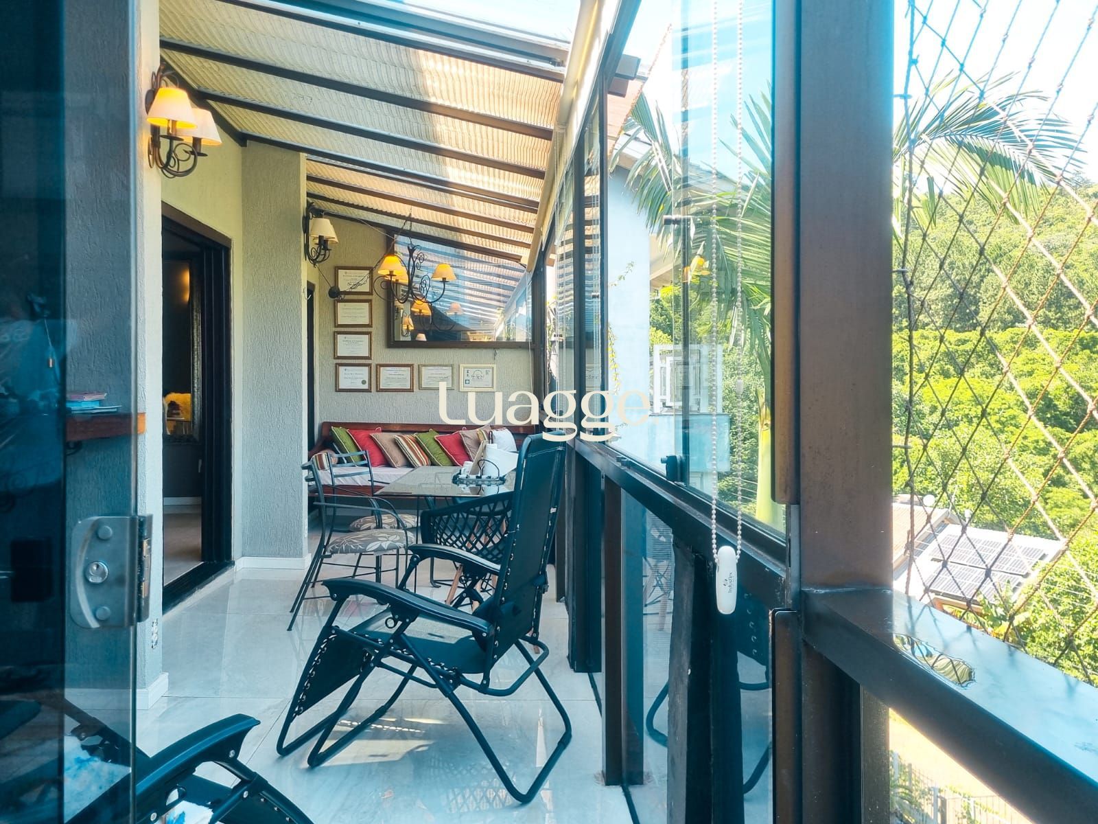 A sala de estar principal conta com pé direito elevado e um charmoso mezanino, que oferece vista para uma segunda sala com varanda envidraçada, permitindo apreciar o visual completo do morro com muita luminosidade natural.