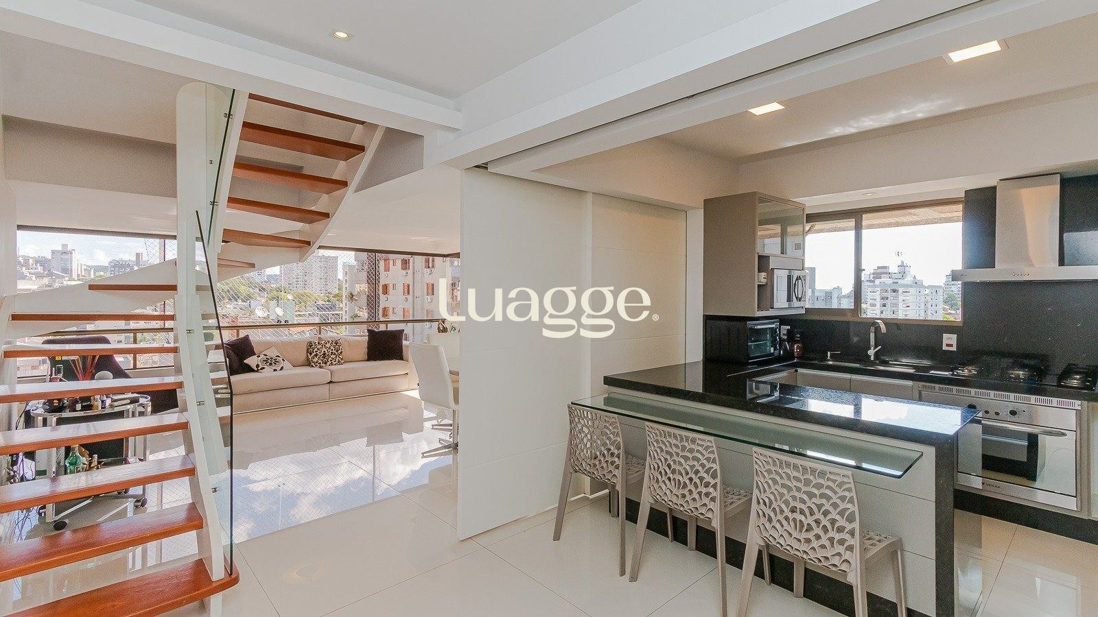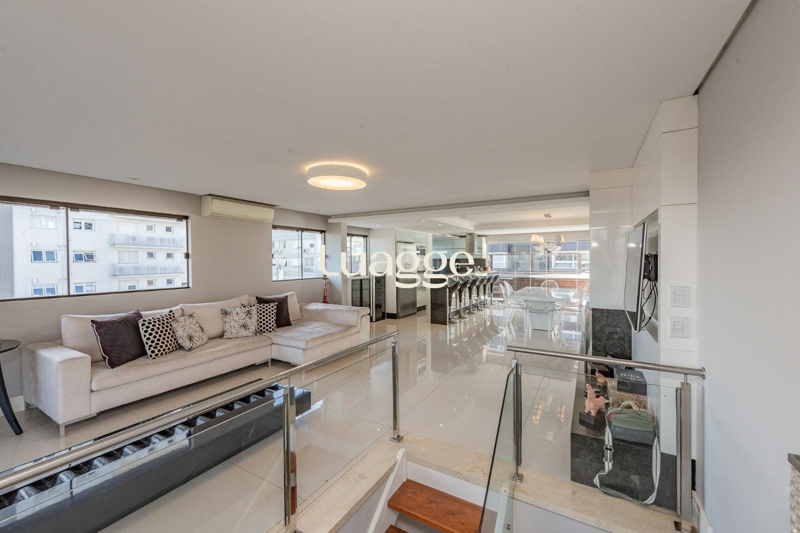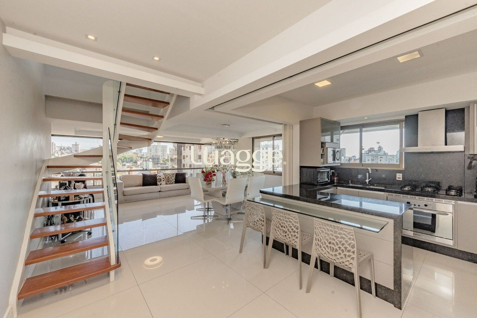 No segundo piso, prepare-se para se surpreender: um amplo living com quase 120 m², ideal para receber amigos e família com conforto e estilo. O espaço conta com uma cozinha gourmet equipada, churrasqueira, bar e acesso ao terraço aberto com piscina – tudo isso com uma vista panorâmica incrível.