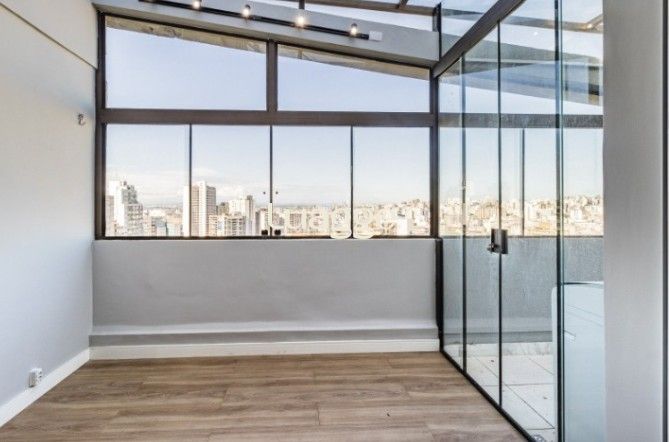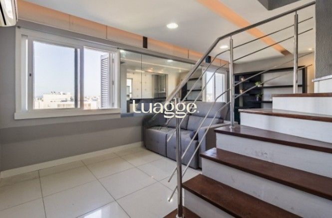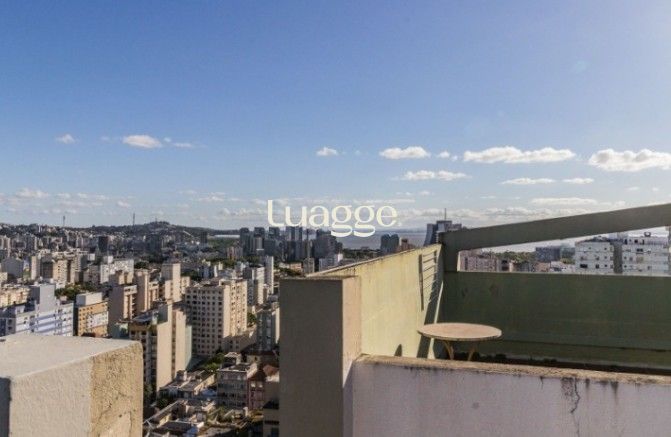 Cobertura Duplex e apartamento JK na Rua Duque de Caxias em Porto Alegre. Vista panorâmica. Mobiliada. Porteira fechada. Andar alto. Ensolarada. Dois dormitórios sendo 1 suíte, possibilidade de um terceiro dormitório, banheiro social, lavabo. Duas cozinhas planejadas, churrasqueira, lavanderia e terraço.