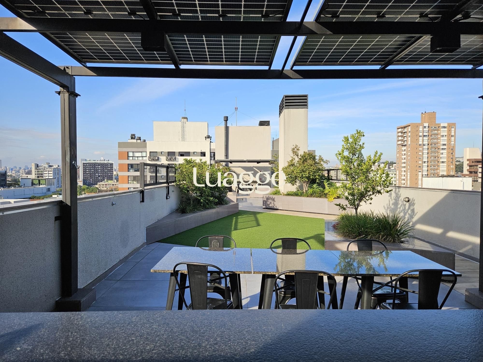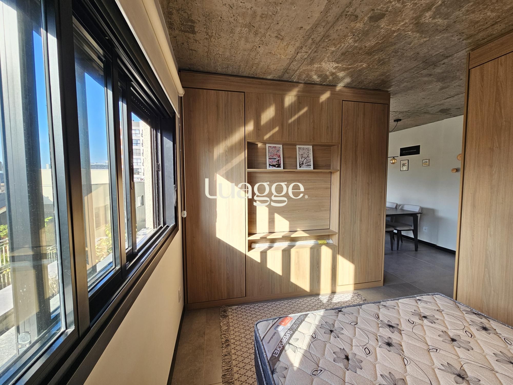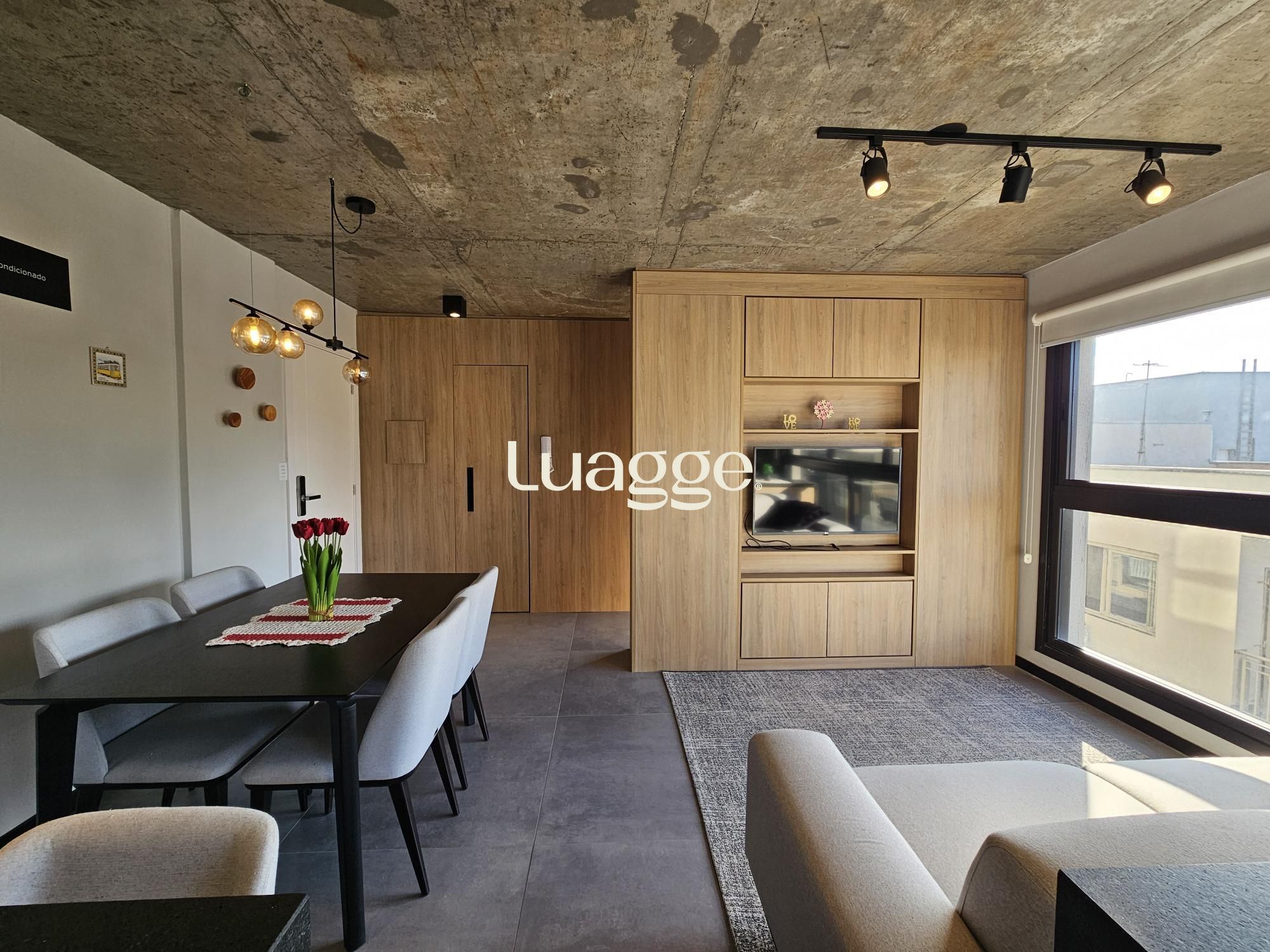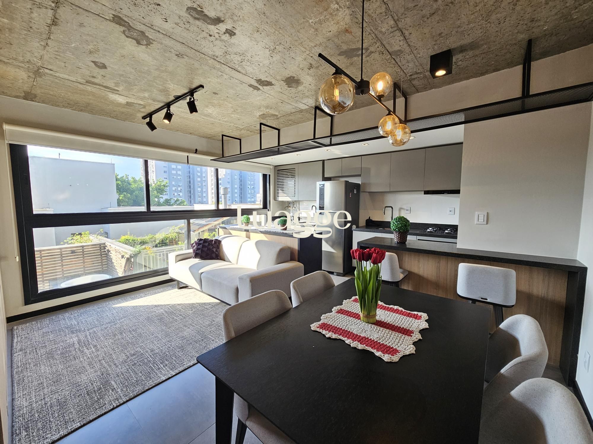 Lindo apartamento tipo studio com 43m2 privativos, 100% mobiliado (era o decorado da construtora). Ampla janela no living, vista definida, sol norte e churrasqueira. Vaga dupla de garagem. Edifício com painéis solares, salão de festas, academia, terraço com parrilla e piscina.