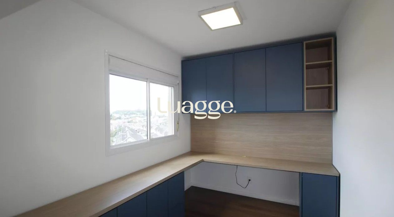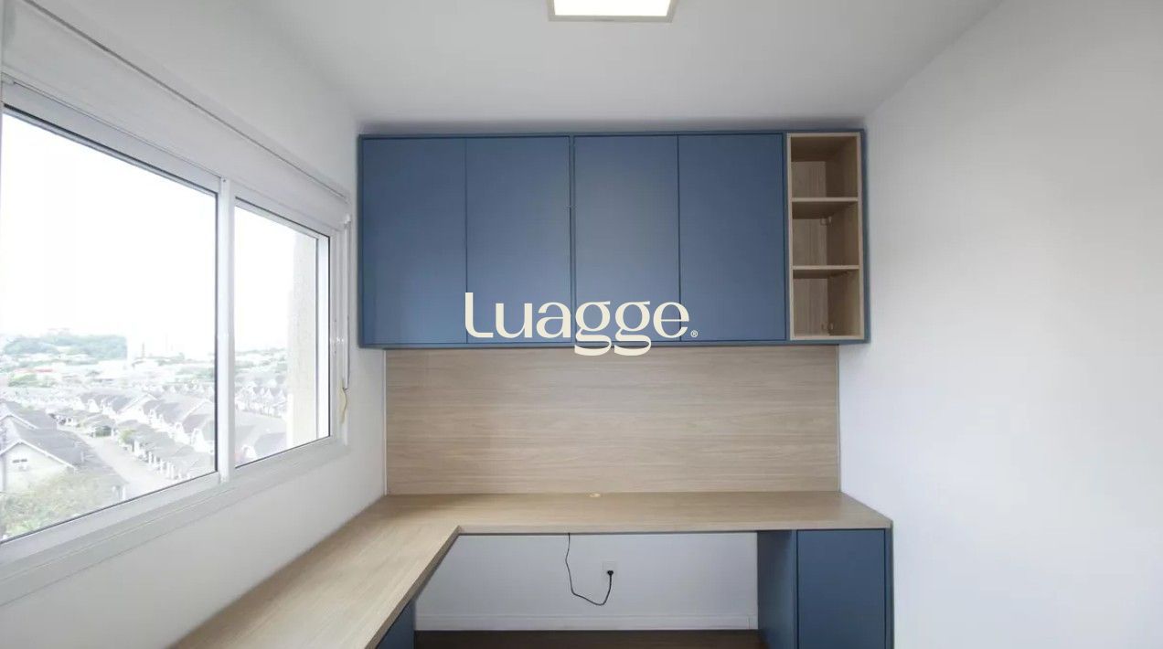 O segundo dormitório está configurado como escritório, com escrivaninha e armários.