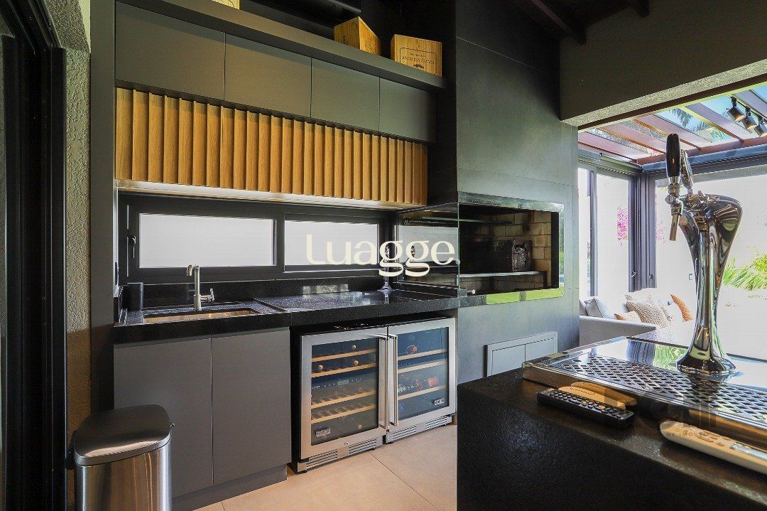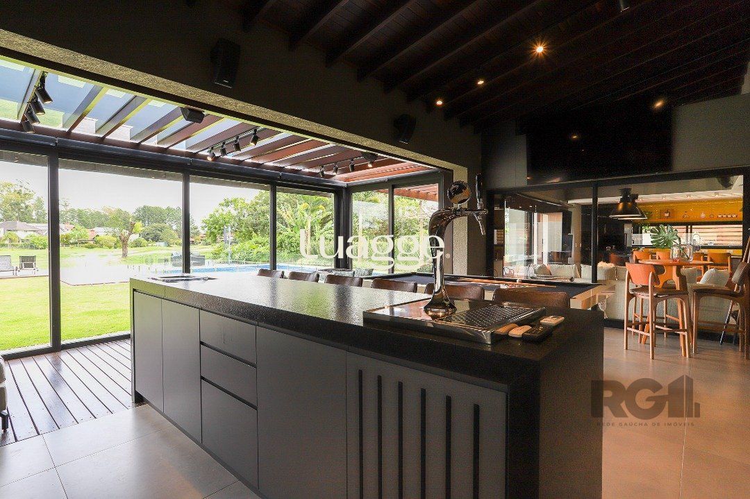A cozinha é em conceito aberto, com ilha central e churrasqueira, conectando-se aos demais ambientes sociais. Dispõe ainda de escritório, espaço gourmet com churrasqueira, varanda e um belíssimo jardim com piscina e vista para o lago, proporcionando um ambiente perfeito para lazer e convivência.