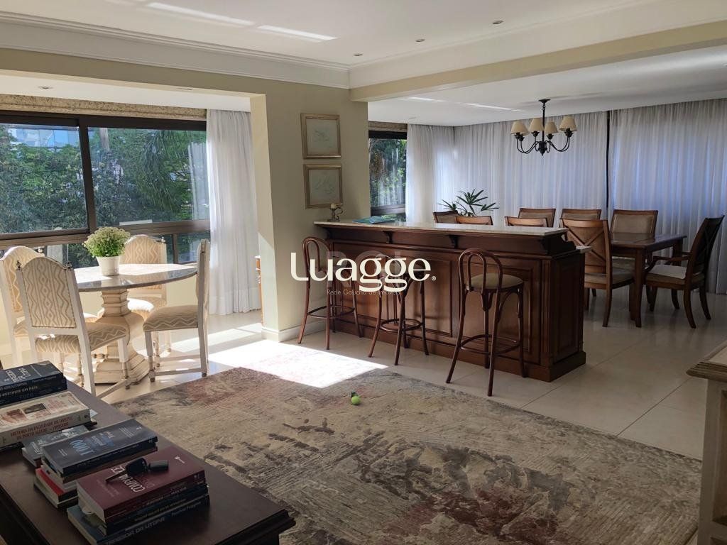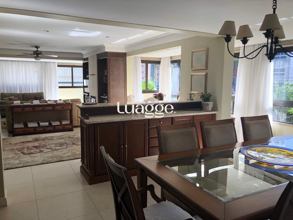 Com três (3) suítes , sendo uma (1) suíte master com hidromassagem, opção de quarto dormitório, quatro(4) vagas de garagem , semi-mobiliado, gabinete com acesso pela área social, living para 3 ambientes, lareira, sala de jantar com churrasqueira, lavabo. Cozinha com copa, lavanderia espaçosa, dependência completa, depósito no térreo, ensolarado, sol da manhã e da tarde. Prédio imponente de ótimo padrão, fachada totalmente revestida em granito e pastilha, um (1) apartamento por andar. Portaria 24 horas e vagas para visitantes.