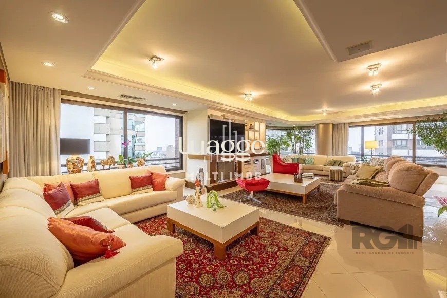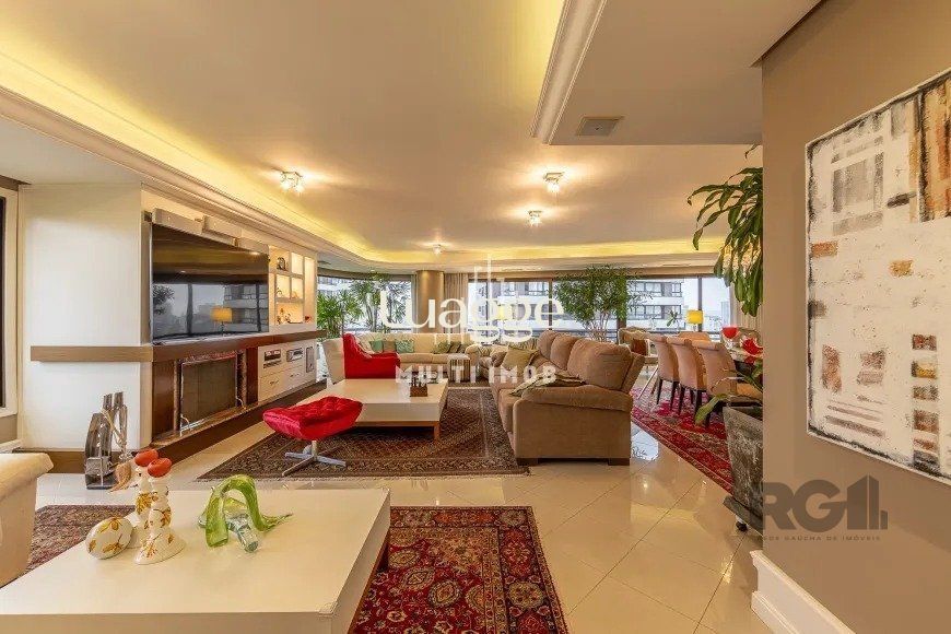 Apartamento com hall de entrada privativo, amplo living para 5 ambientes com lareira, churrasqueira, ar central setorizado e vista panorâmica.