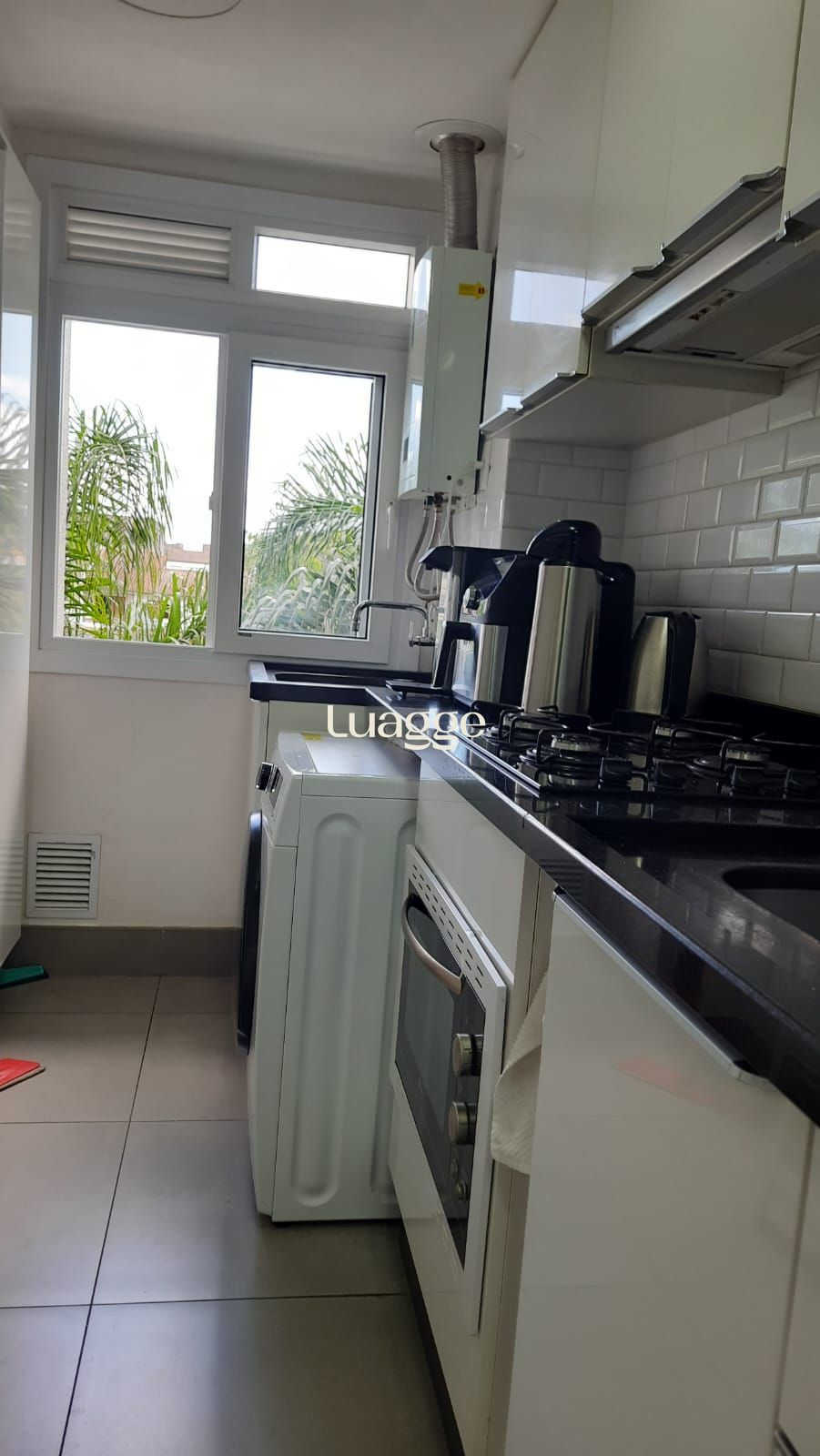 Cozinha com churrasqueira e área de serviço integrada.