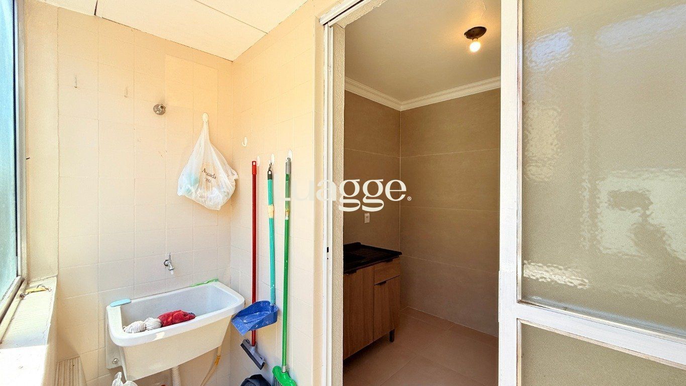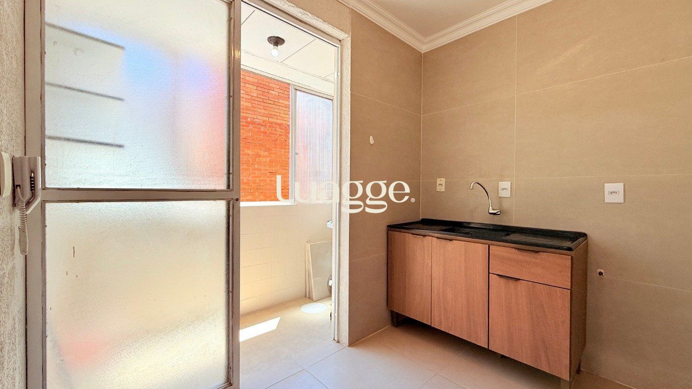 A cozinha é semi-mobiliada, equipada com pia e armário, e possui área de serviço separada e generosa, com tanque instalado e ponto preparado para máquina de lavar