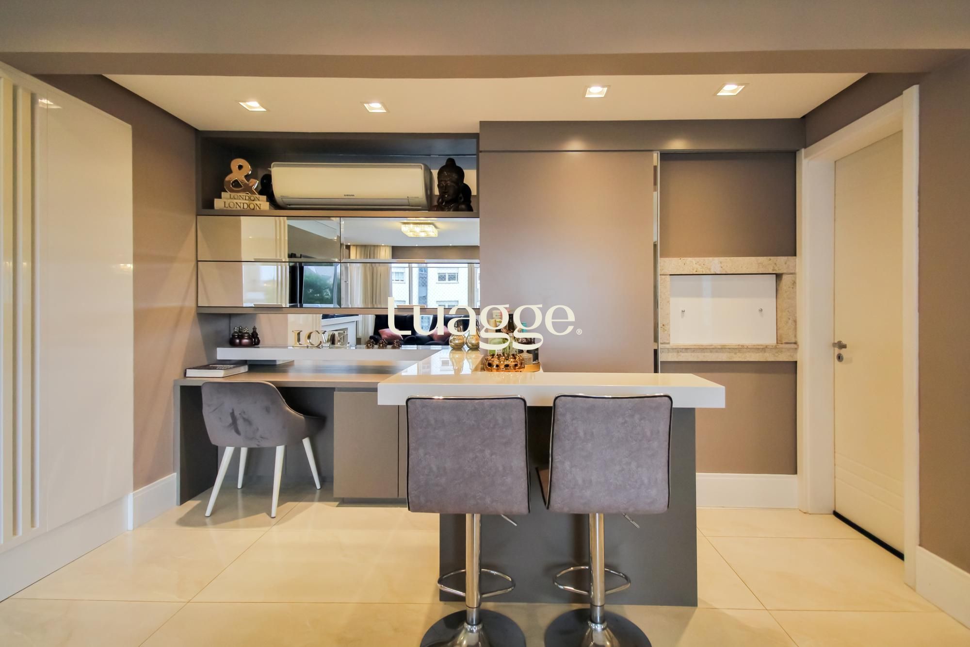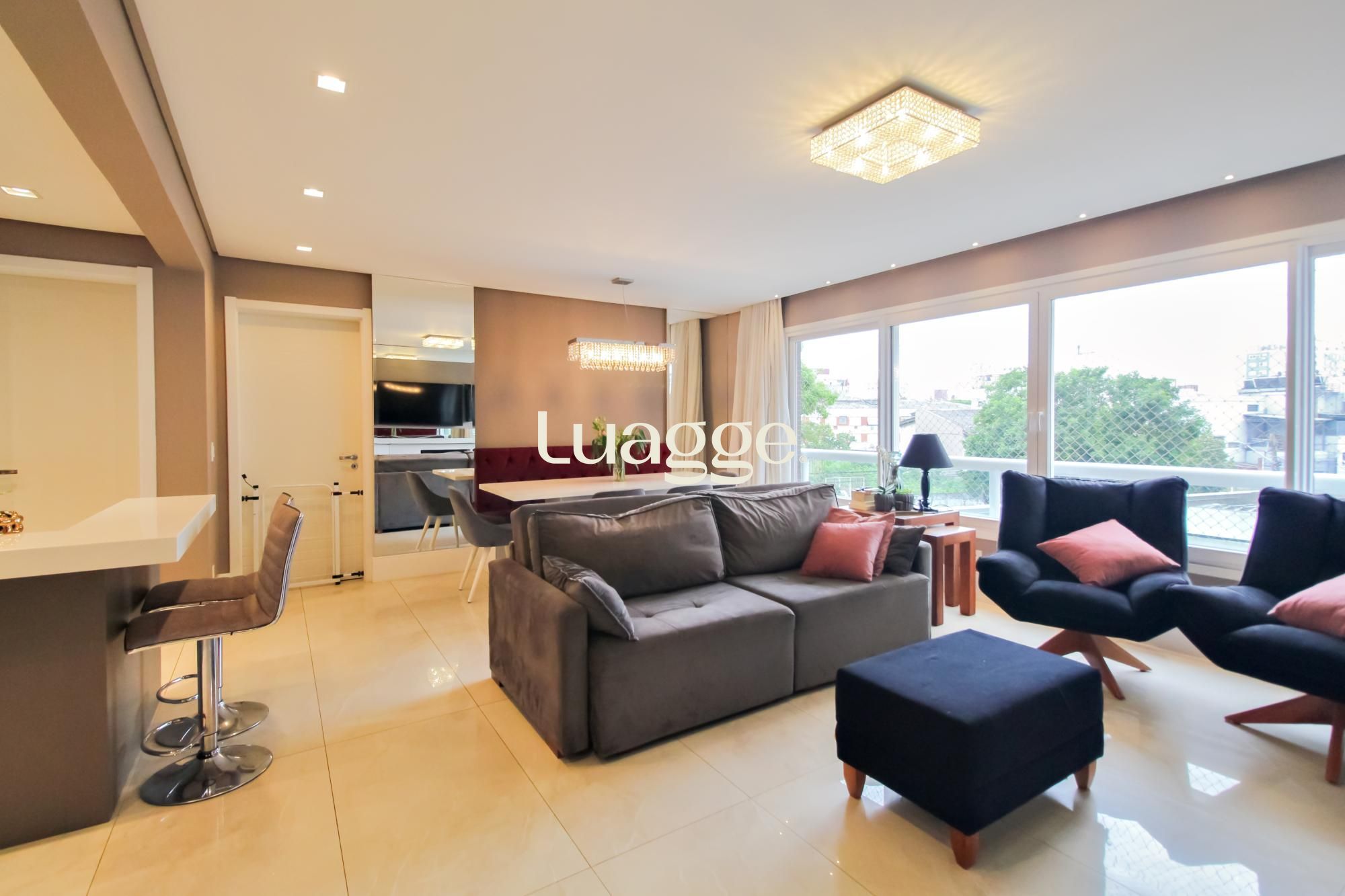 Apartamento no bairro Menino Deus em Porto Alegre. Semi mobiliado com móveis de excelente qualidade, 3 suítes, lavabo, living amplo com lareira, espaço churrasqueira, cozinha, lavanderia, banheiro auxiliar. Vaga de garagem dupla, coberta e escriturada.