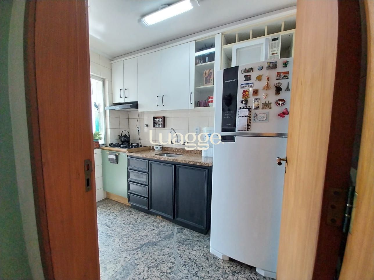 Cozinha montada com móveis sob medida e fogão incluso.