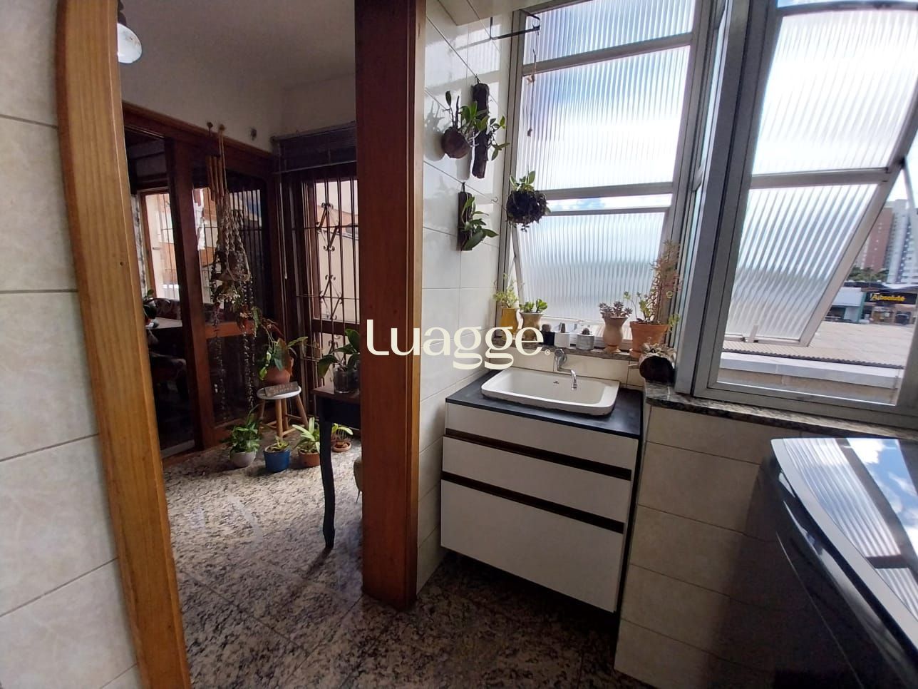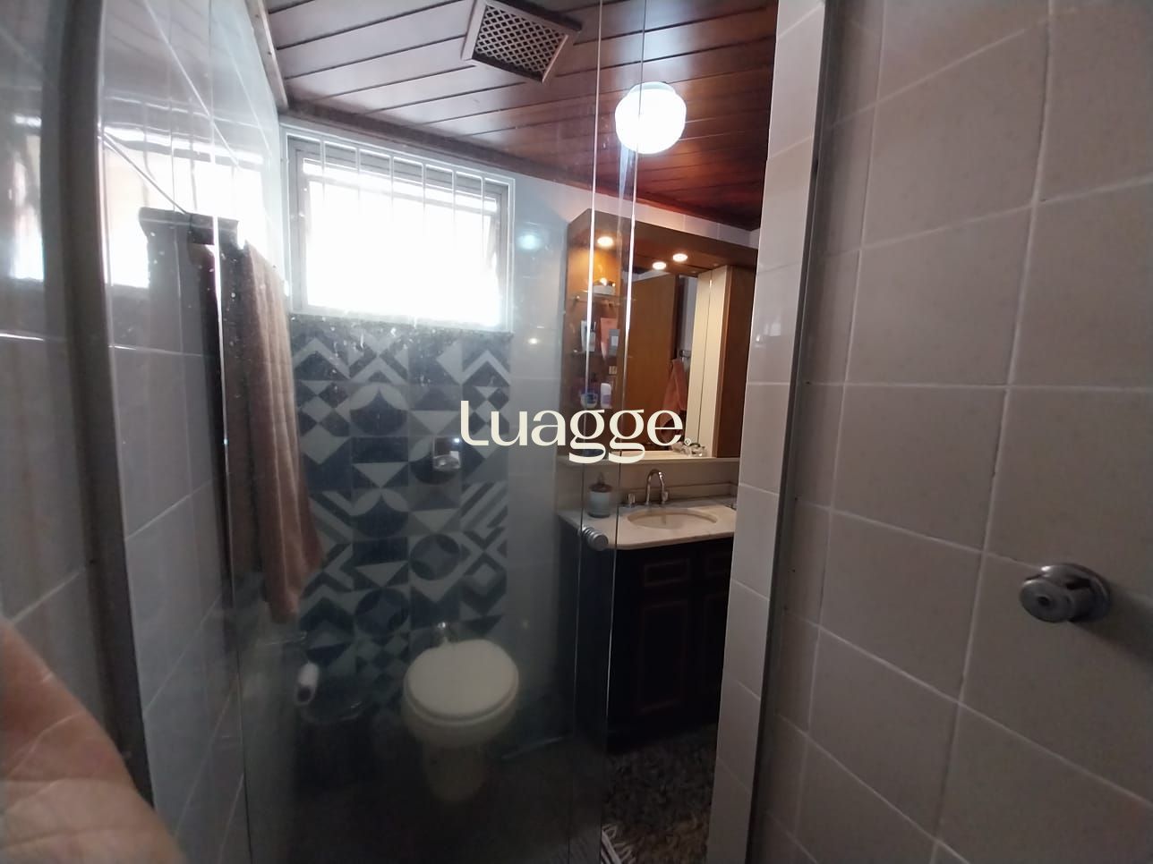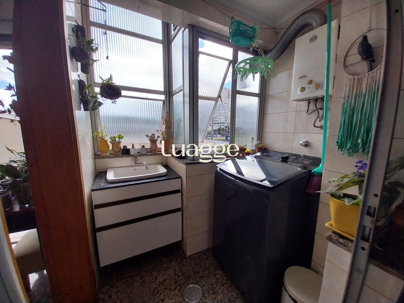 Banheiro com ventilação natural e sistema de aquecimento central de água.