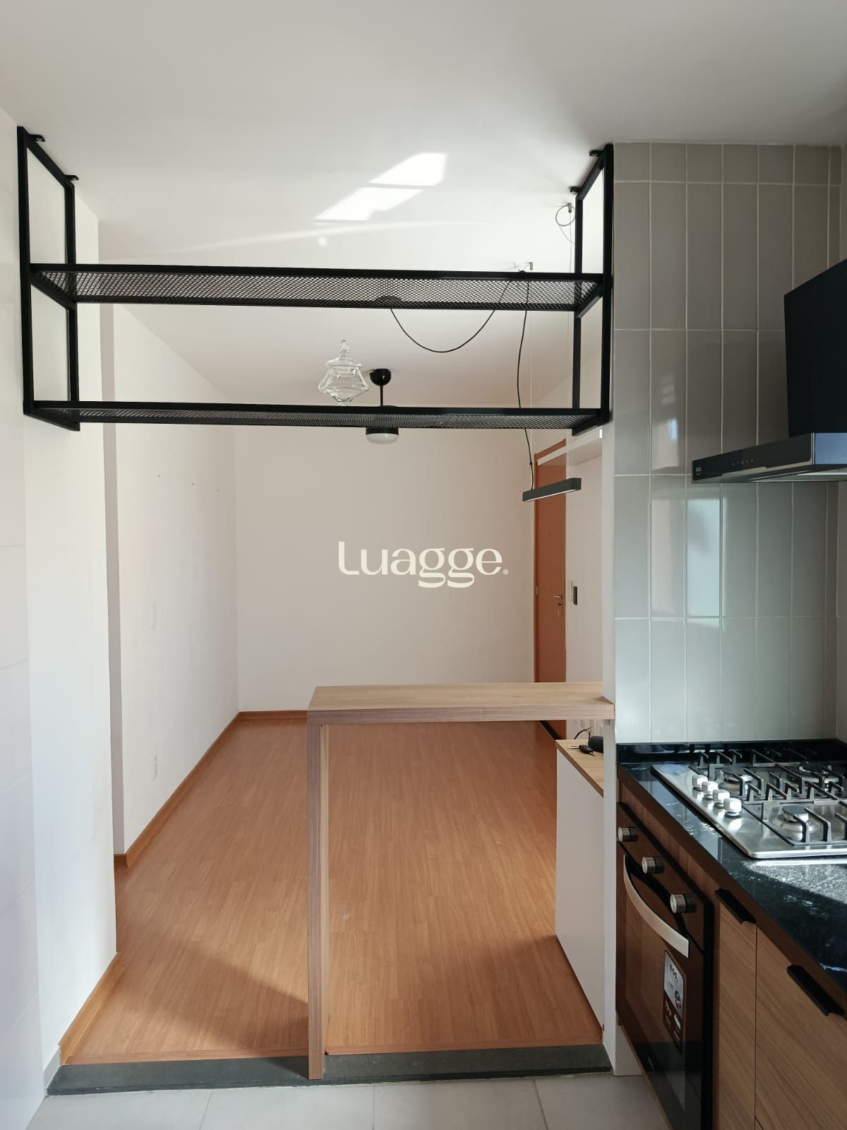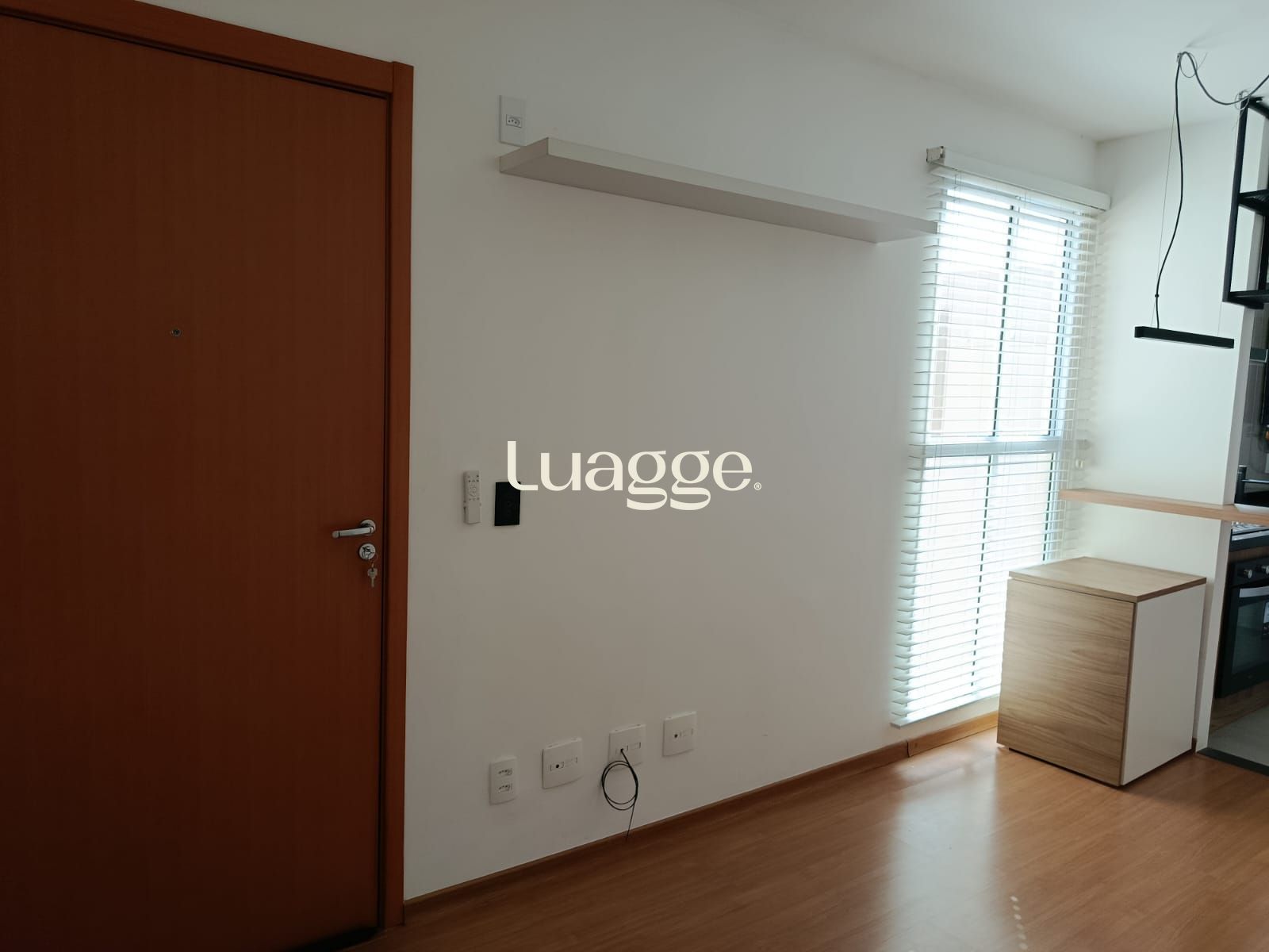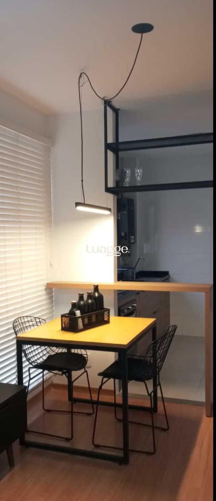 Sala Piso Laminado; Interruptor inteligente, 3 vias, compatível com Alexa, Obs : controla iluminação do ventilador e pendente, podendo adicionar mais uma iluminação; Ventilador de teto (tecnologia de economia INVERTER), 6 velocidades e com iluminação para duas lâmpadas; Iluminação Pendente de Led Slin 90cm; Persiana branca toda em poliuretano (fácil de limpar e não resseca com o sol).