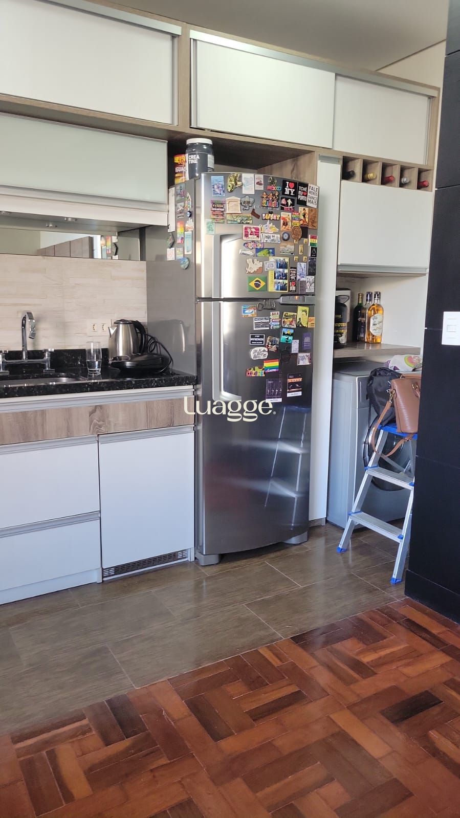 depurador de ar embutido, geladeira, mesa com cadeiras, armários