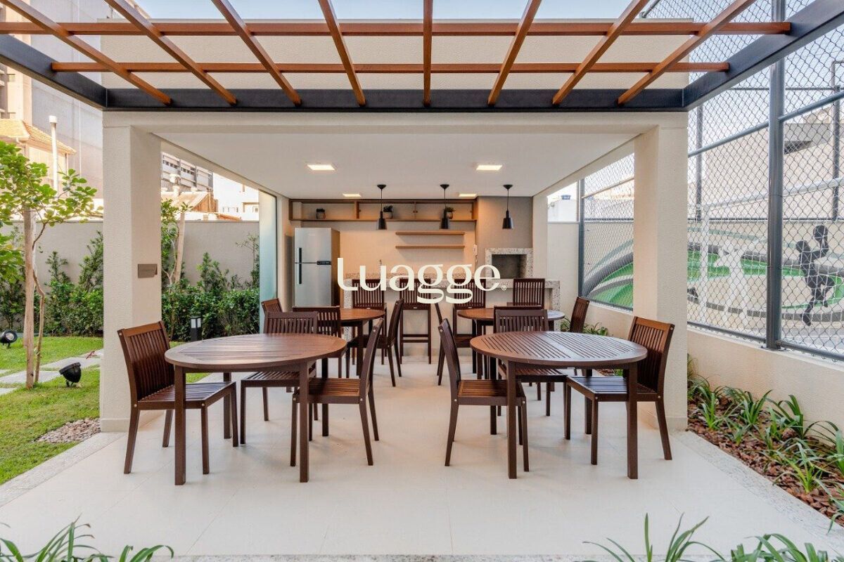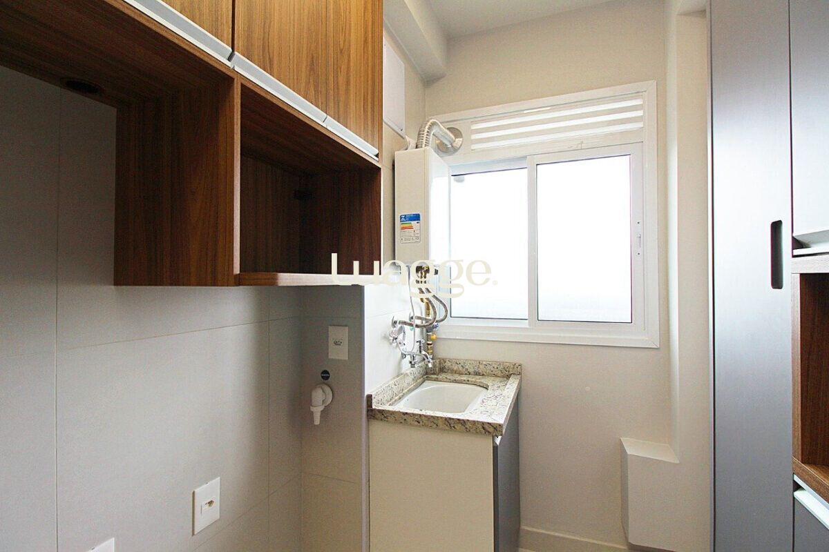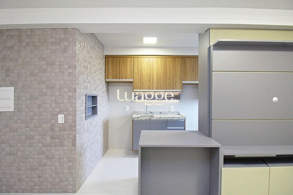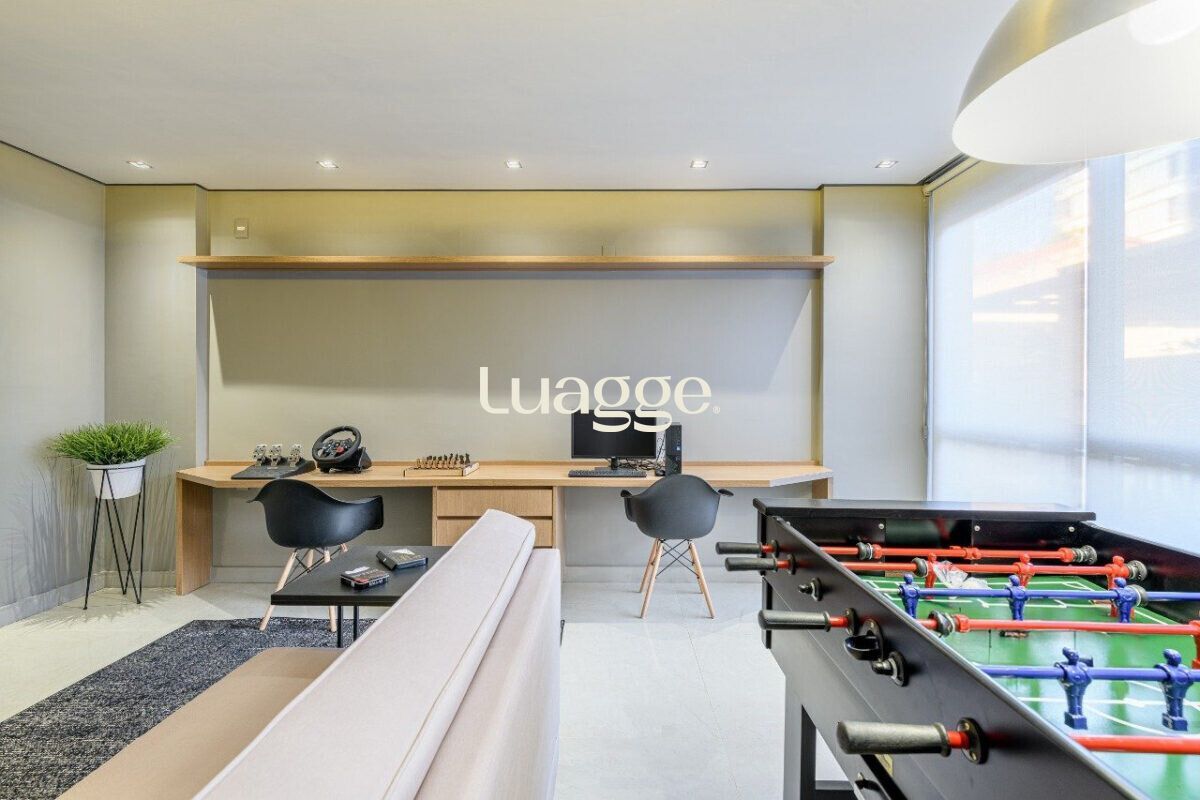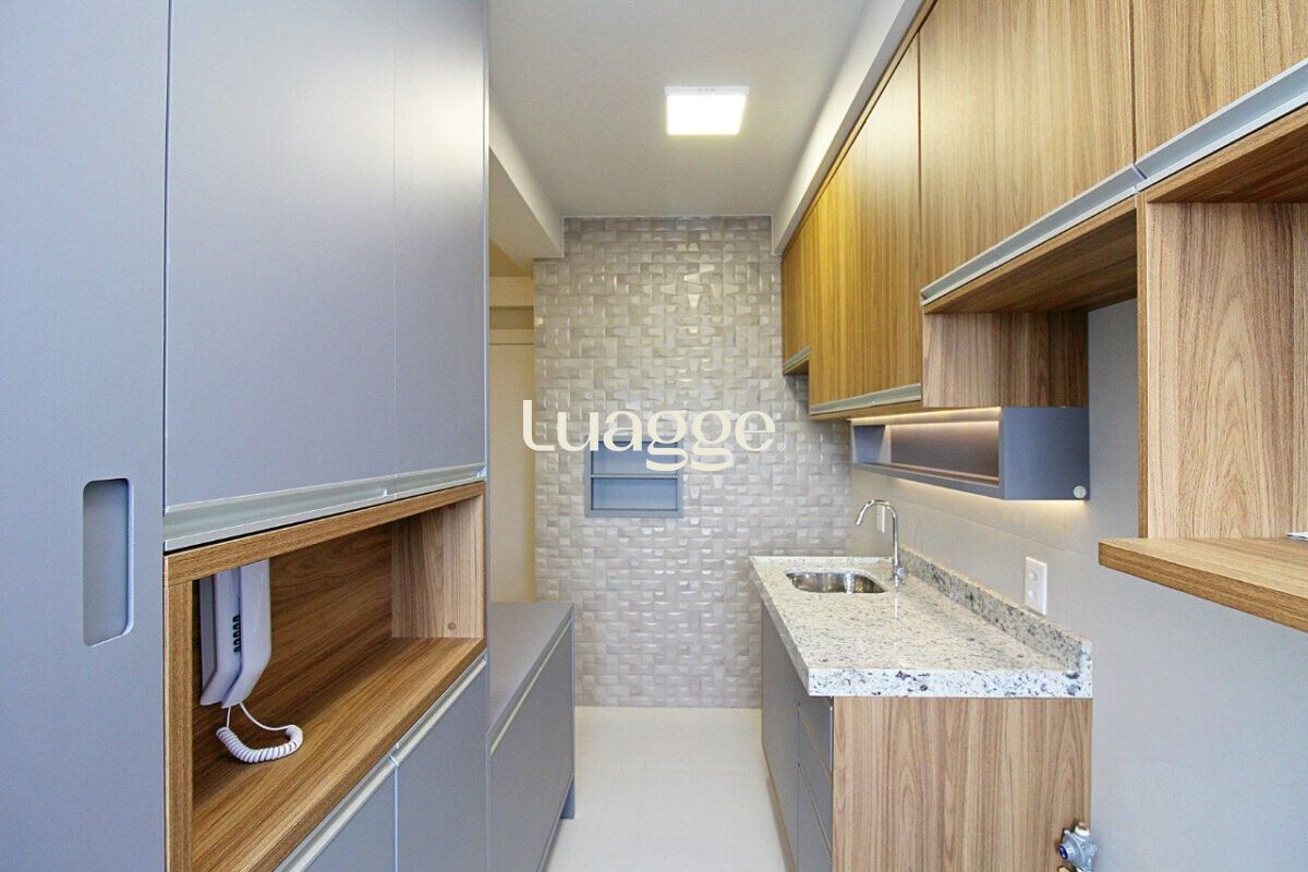 O imóvel conta com sala ampla, dois dormitórios, sendo uma suíte, além de banheiro social, ambos com box de vidro. A cozinha americana, integrada à área social, possui churrasqueira e área de serviço funcional.