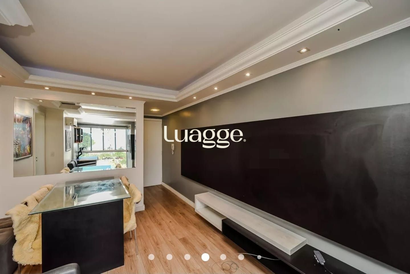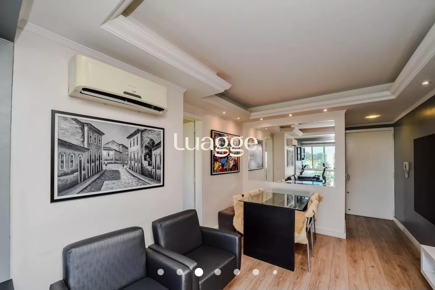 -SALA (Mesa de jantar em vidro e mais quatro cadeiras, duas poltronas, escrivania para estudo com cadeira de escritório, rac da tv, um split de ar, e decoração.
