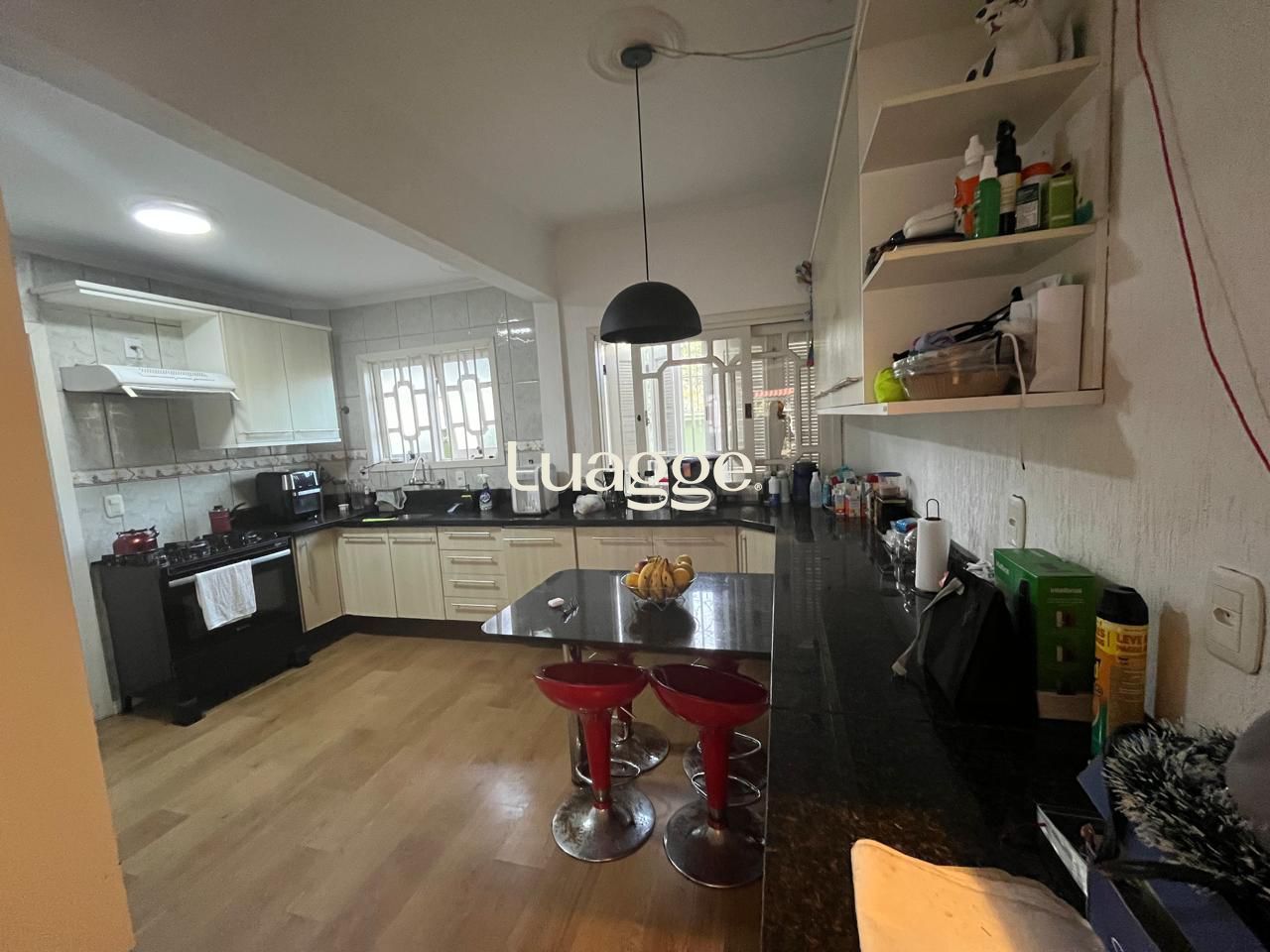 Ampla sala de estar, com lareira. Cozinha planejada com ampla bancada.