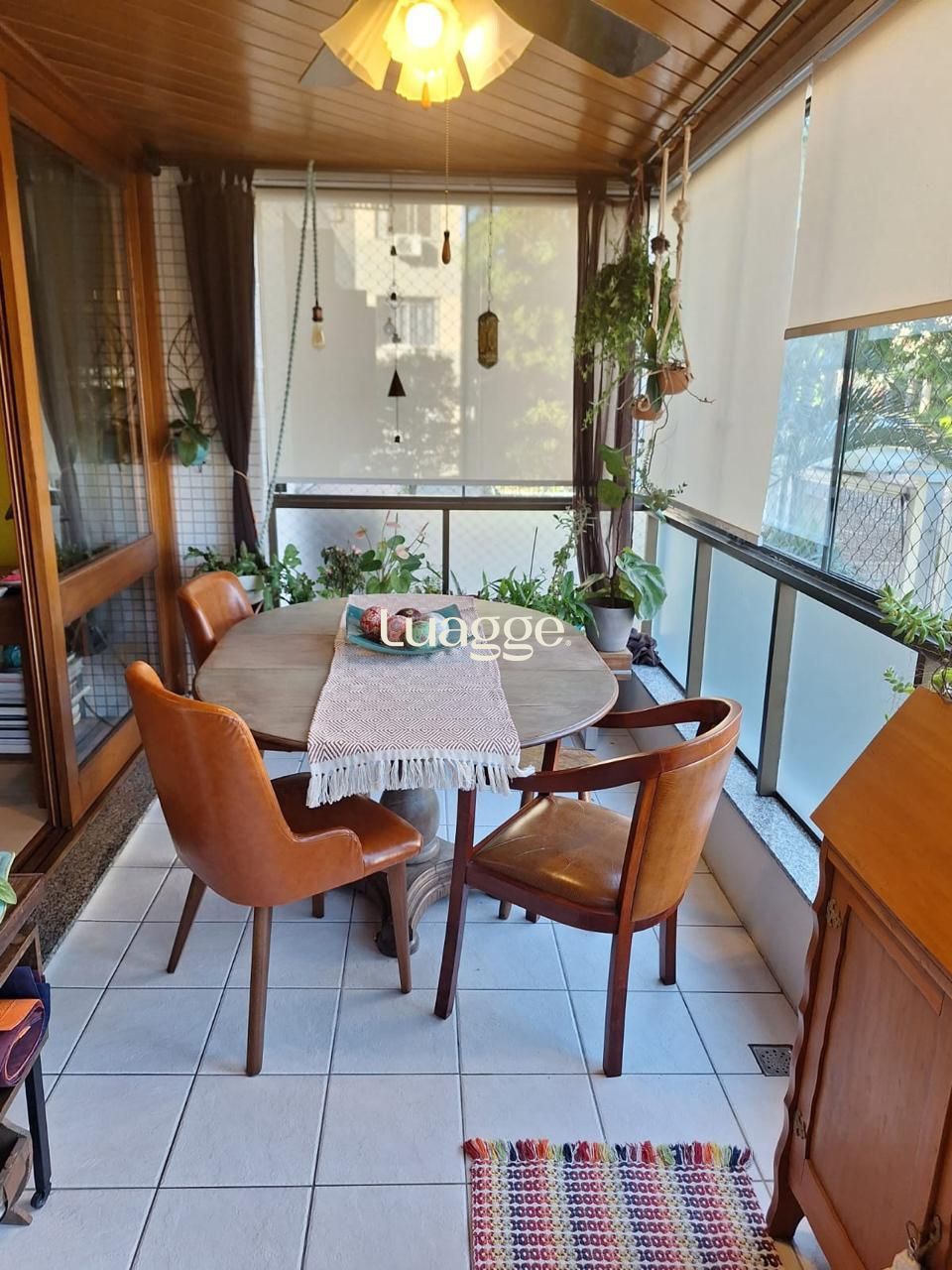 Sacada com churrasqueira, espaço para mesa e vista panorâmica arborizada.