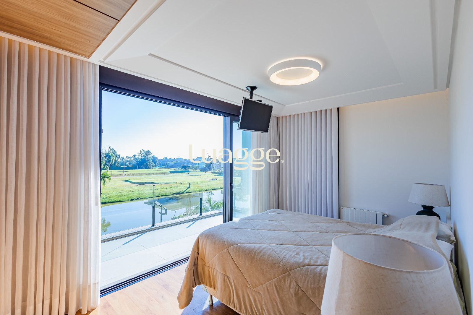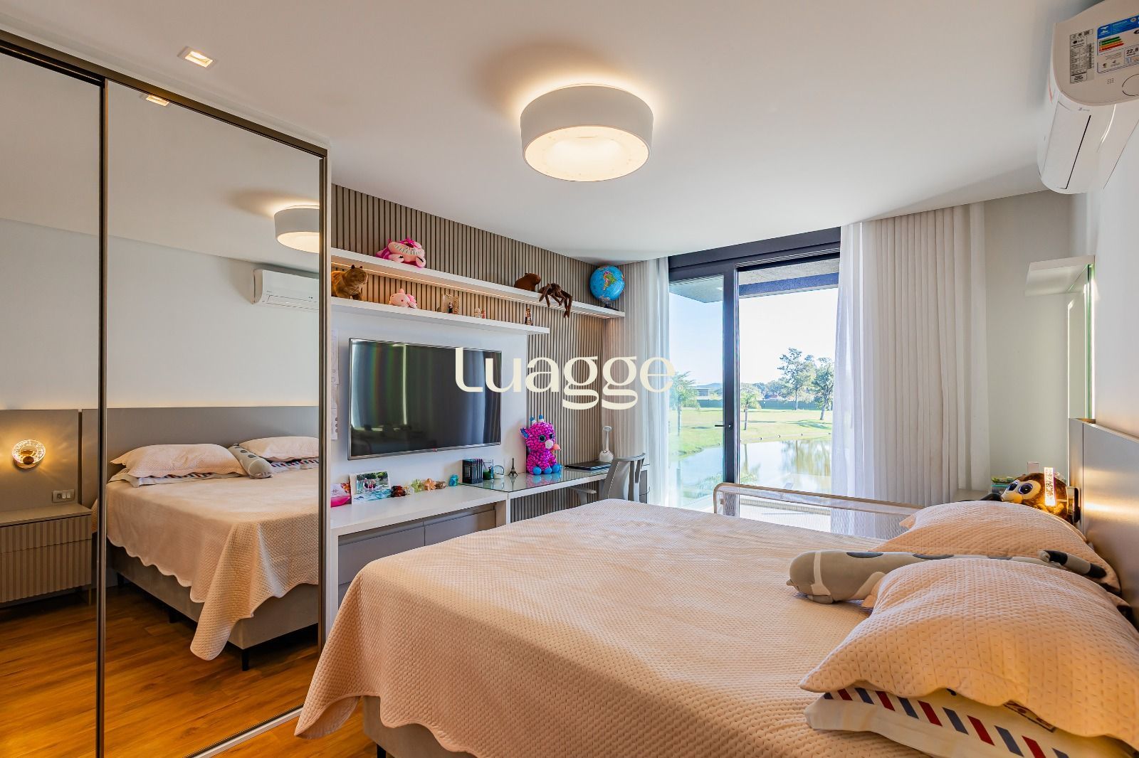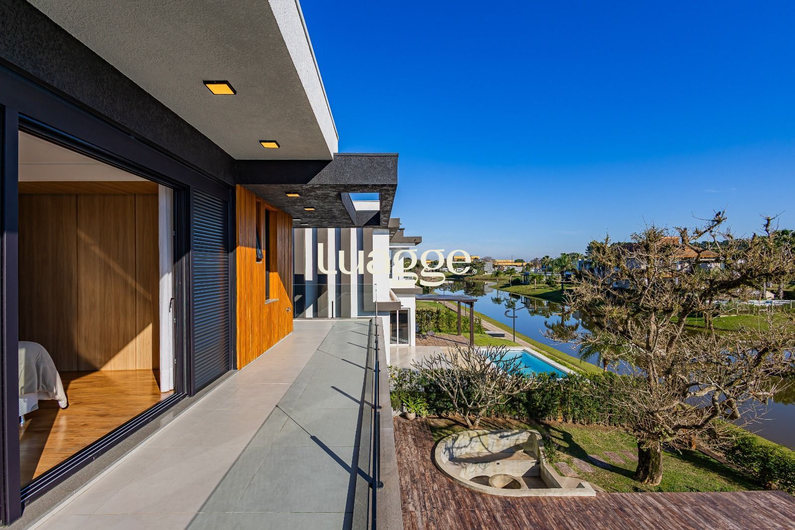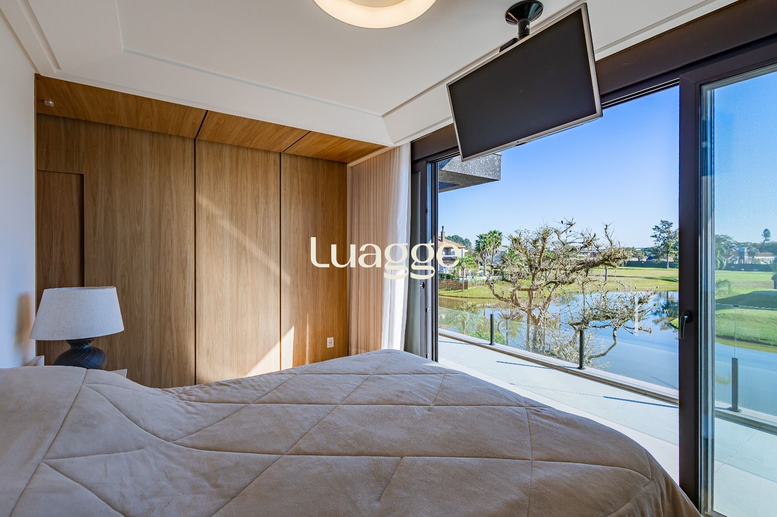 Suíte master com closet espaçoso, hidromassagem e sacada privativa com vista panorâmica para o lago e piscina