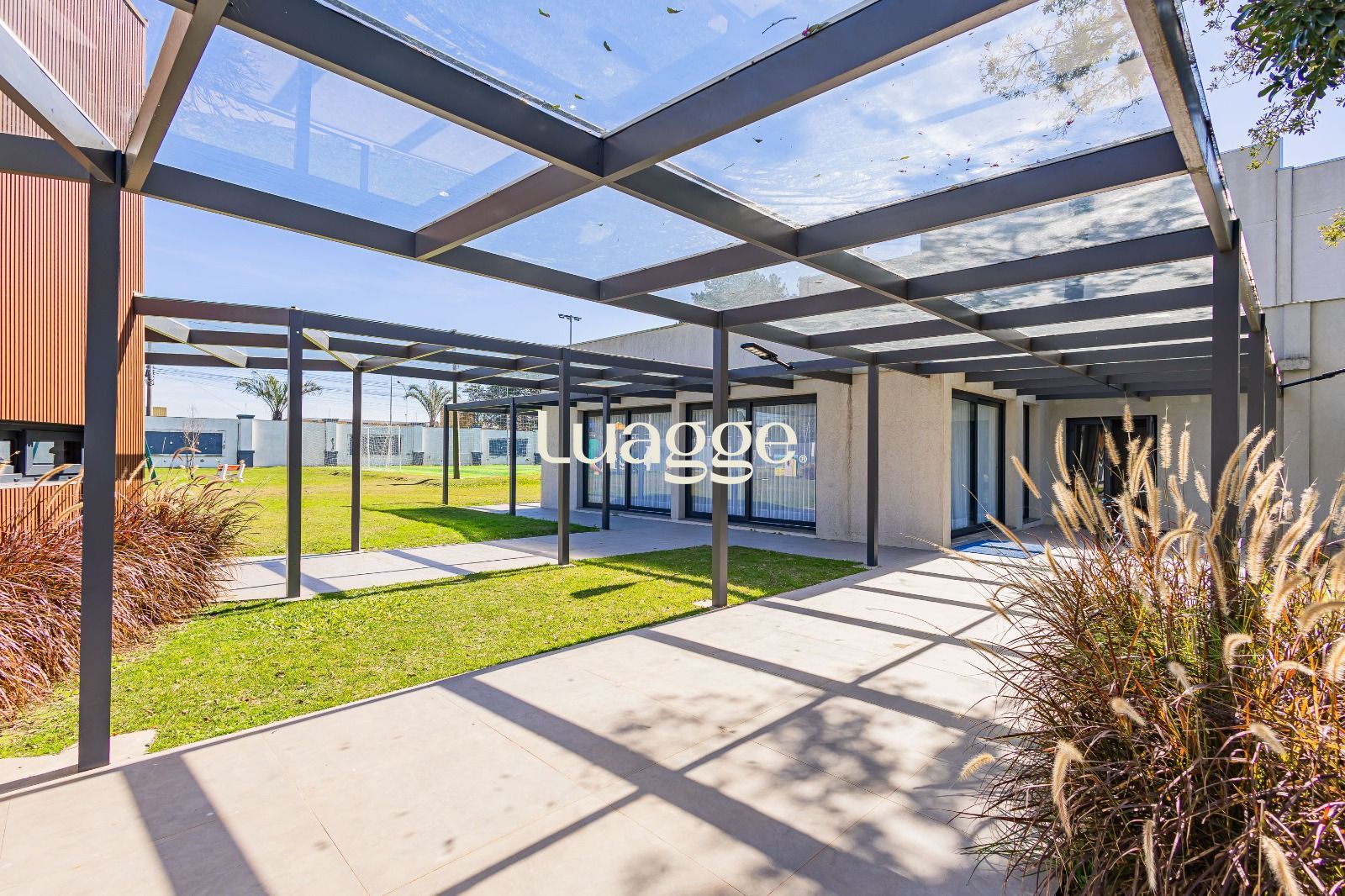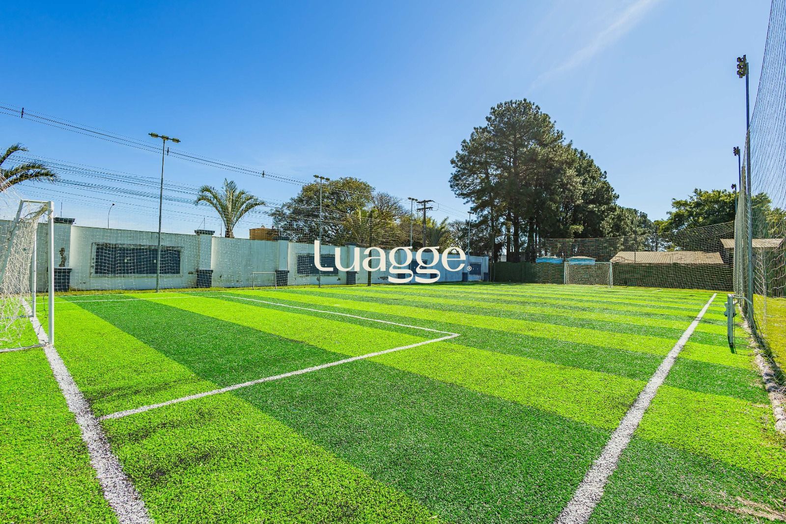Quadra poliesportiva e campo de futebol de grama