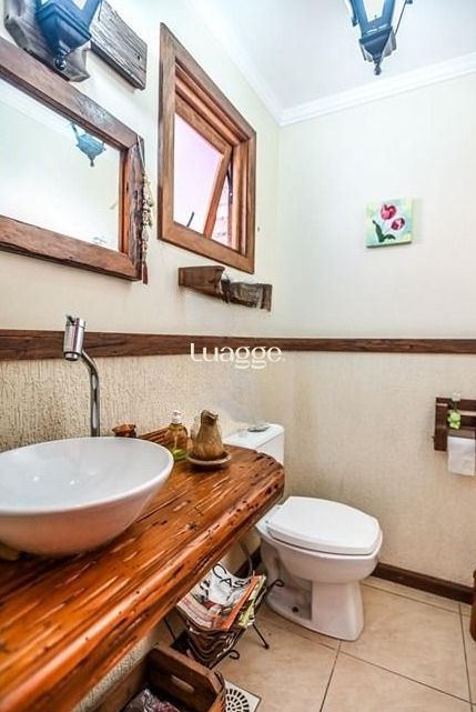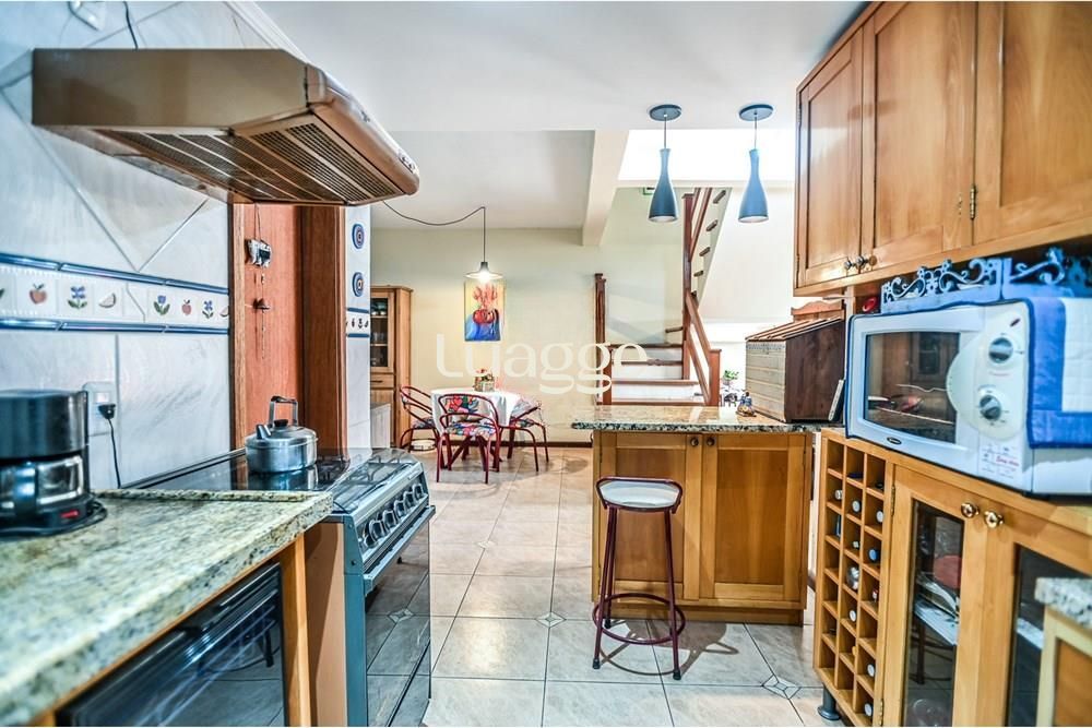Casa em condomínio fechado com 166 metros privativos. Parte inferior: ampla sala com dois ambientes, lareira e janelas grandes. Cozinha americana com área de serviço separada. Lavabo. Parte superior com 2 dormitórios. Um deles com suíte e closet e sacada. No terceiro andar um sotão.