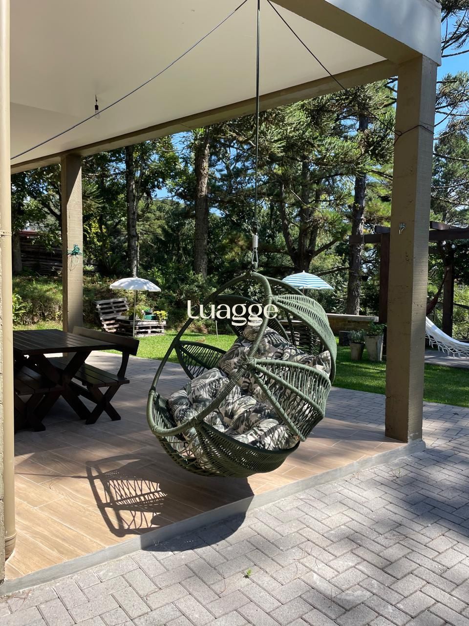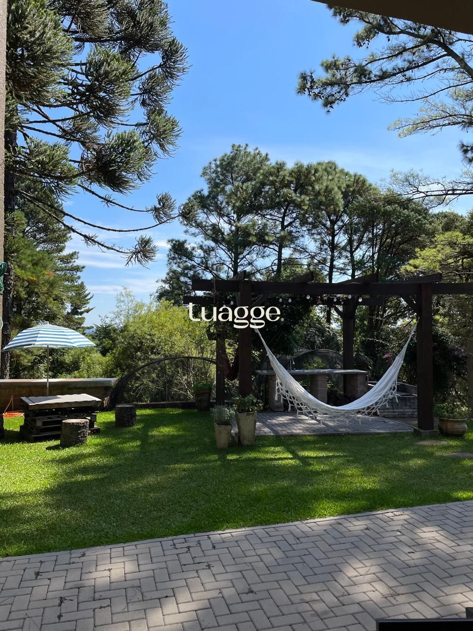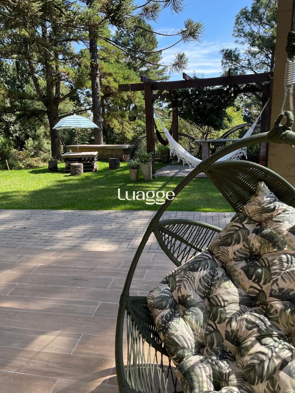 Área externa com churrasqueira, bancada e pia em granito, pergolado, horta e árvores frutíferas.