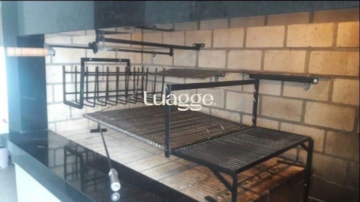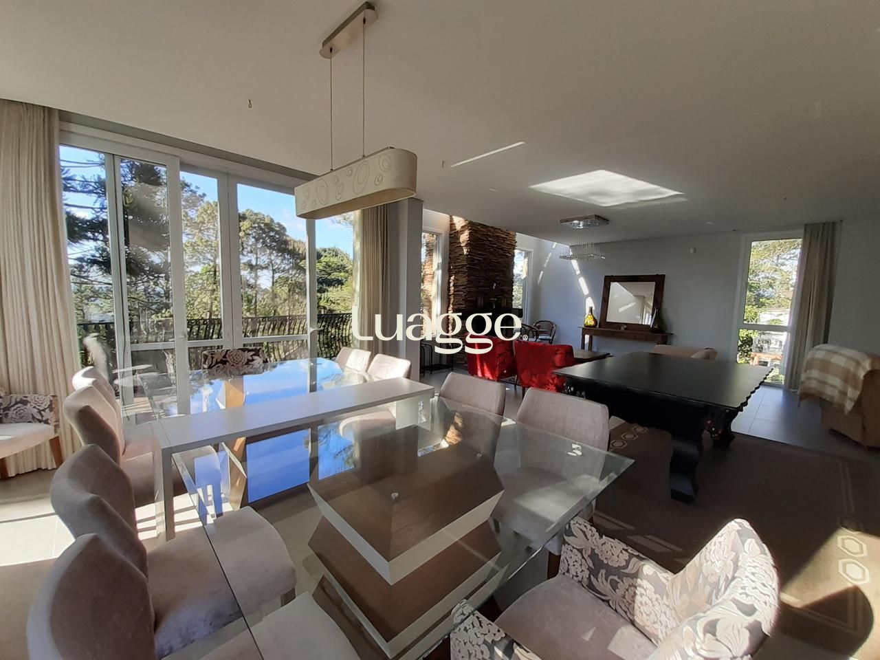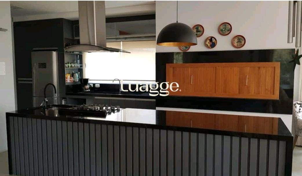 Amplo living com 4 ambientes (TV, lareira, jantar e solarium) integrado à cozinha gourmet planejada com ilha e parrilleira.