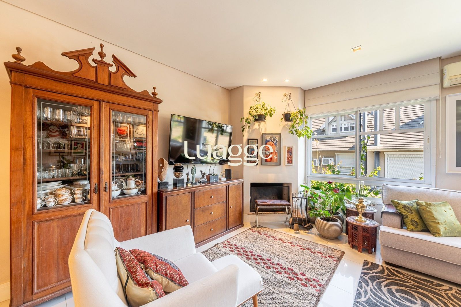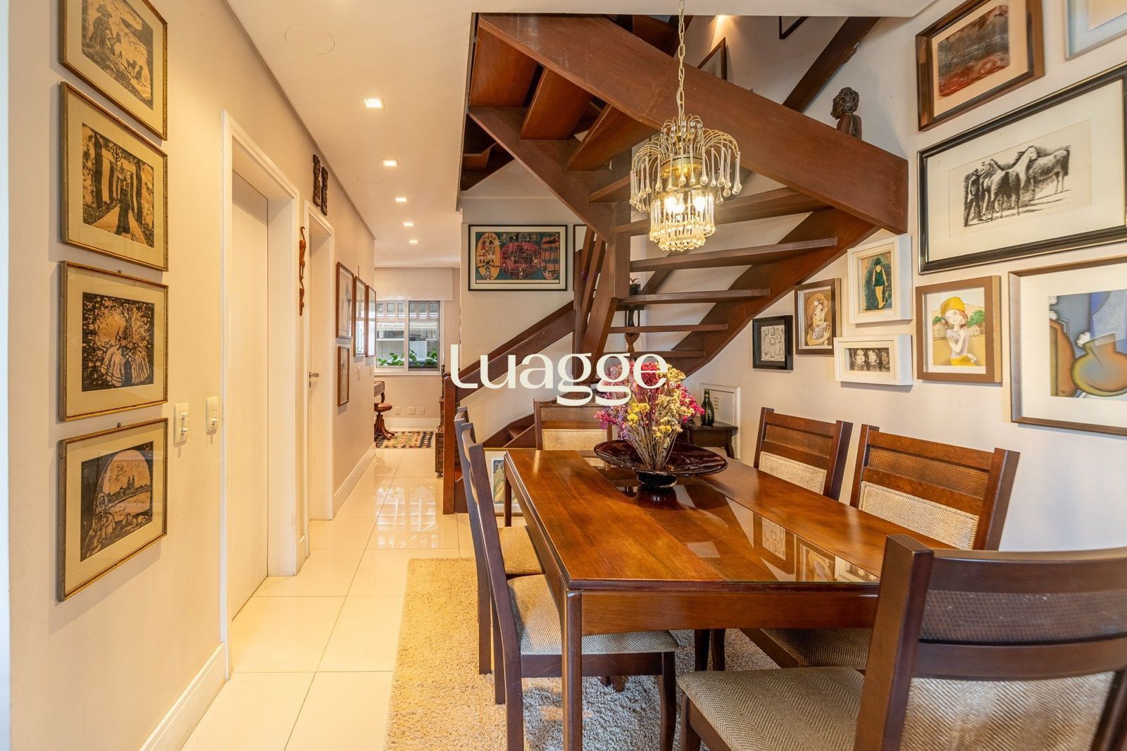 No pavimento térreo há um elegante hall de entrada, lavabo, living amplo com dois ambientes (sala de estar com lareira e sala de jantar), cozinha planejada, área de serviço fechada e área externa aberta. A casa conta com espaço previsto para a instalação de elevador.