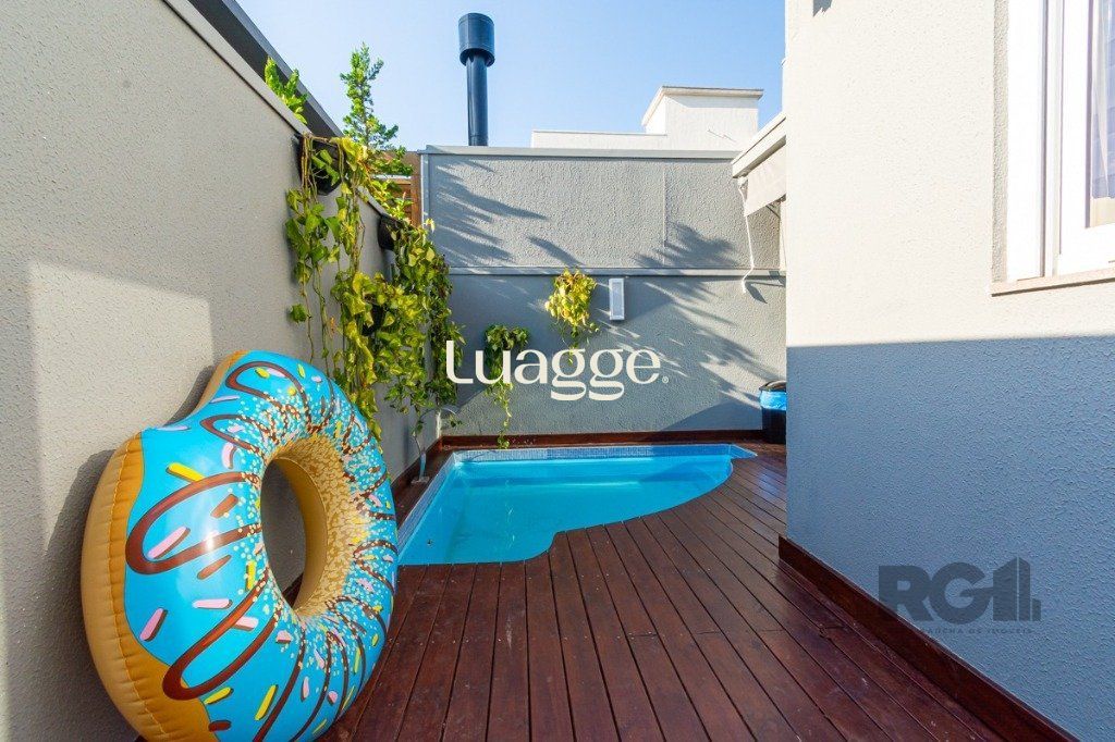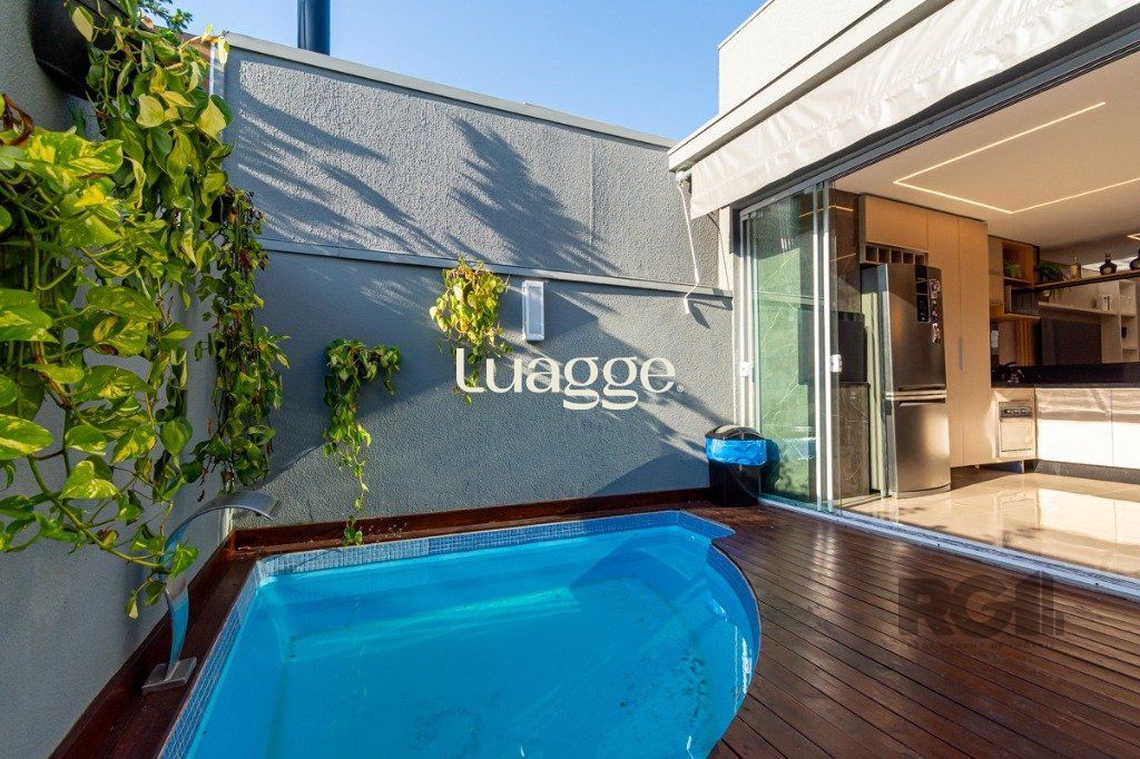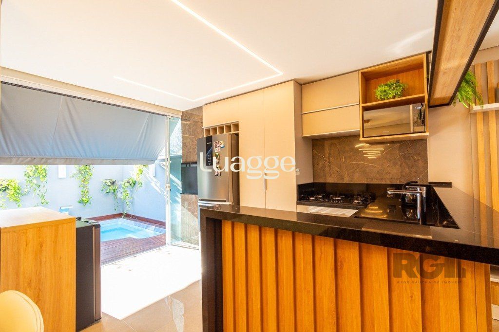 São 3 dormitórios, uma suíte, banheiro social, sala com dois ambientes, cozinha montada e com churrasqueira, pátio com piscina e duas vagas.