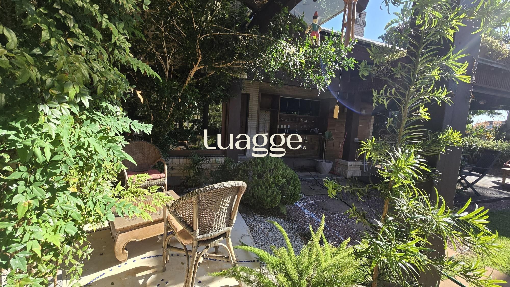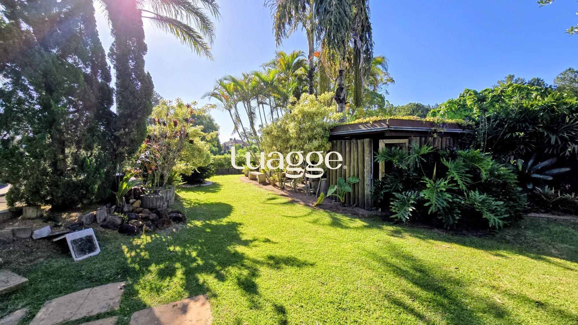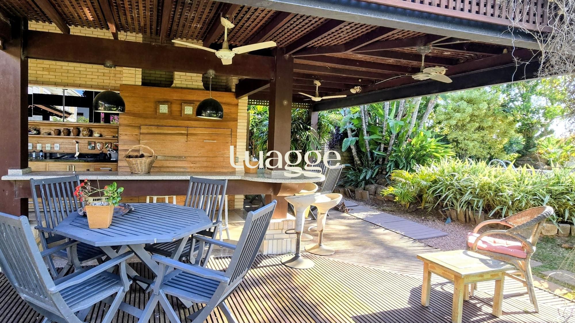 Um espaço gourmet com churrasqueira junto ao jardim com piscina, gramado e lindo paisagismo.