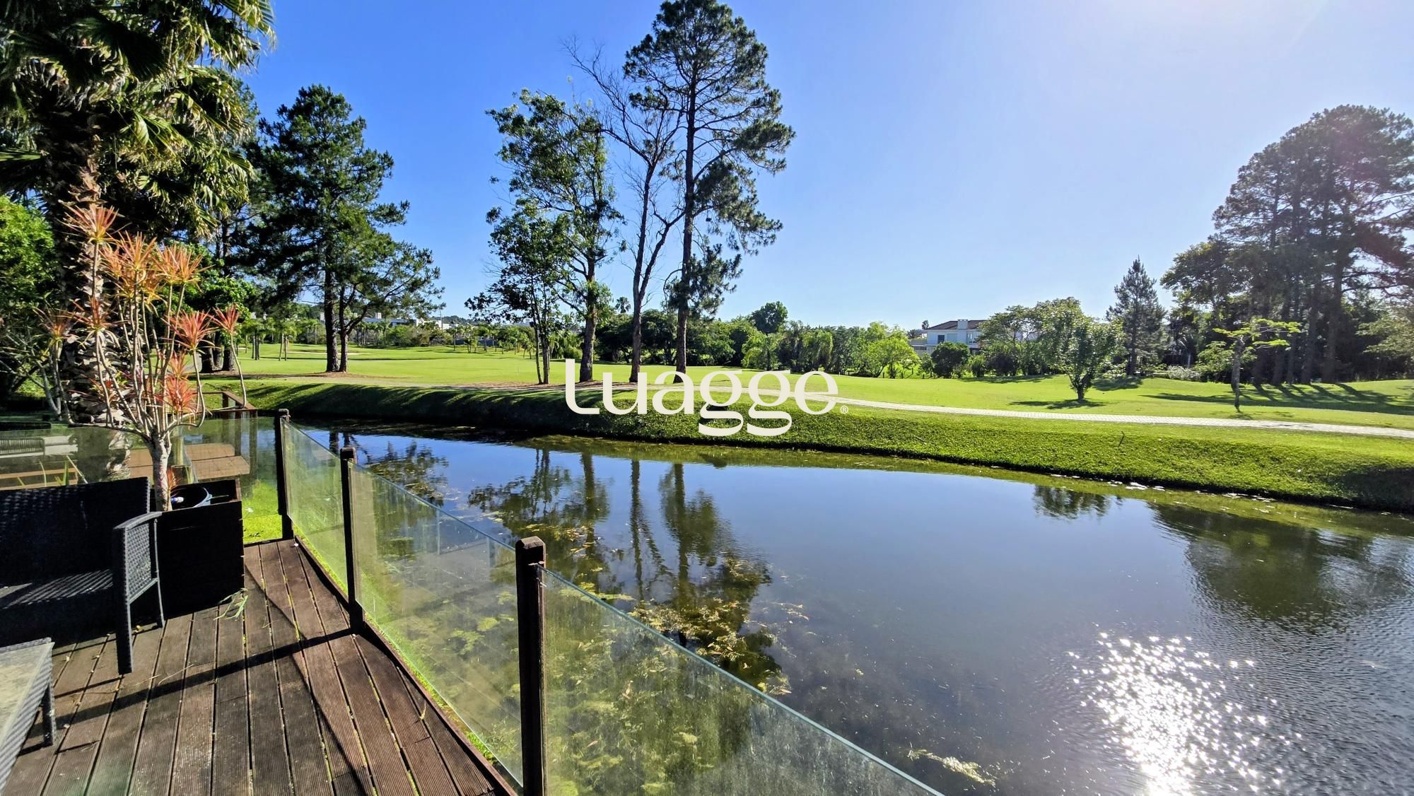 O deck se debruça sobre o lago, com uma vista incrível até o campo de golfe na outra margem.