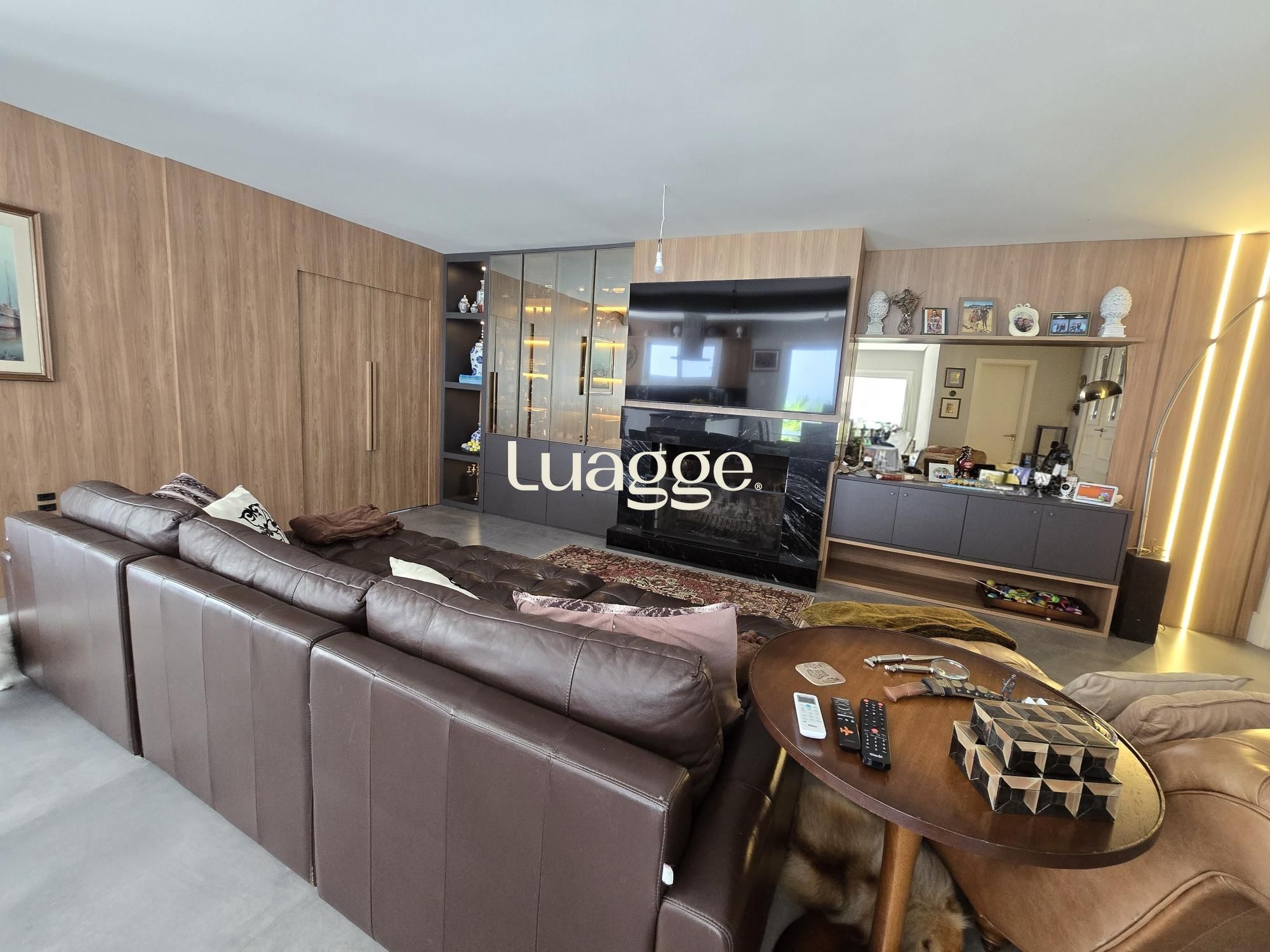 Amplo living com lareira e cozinha integrada.