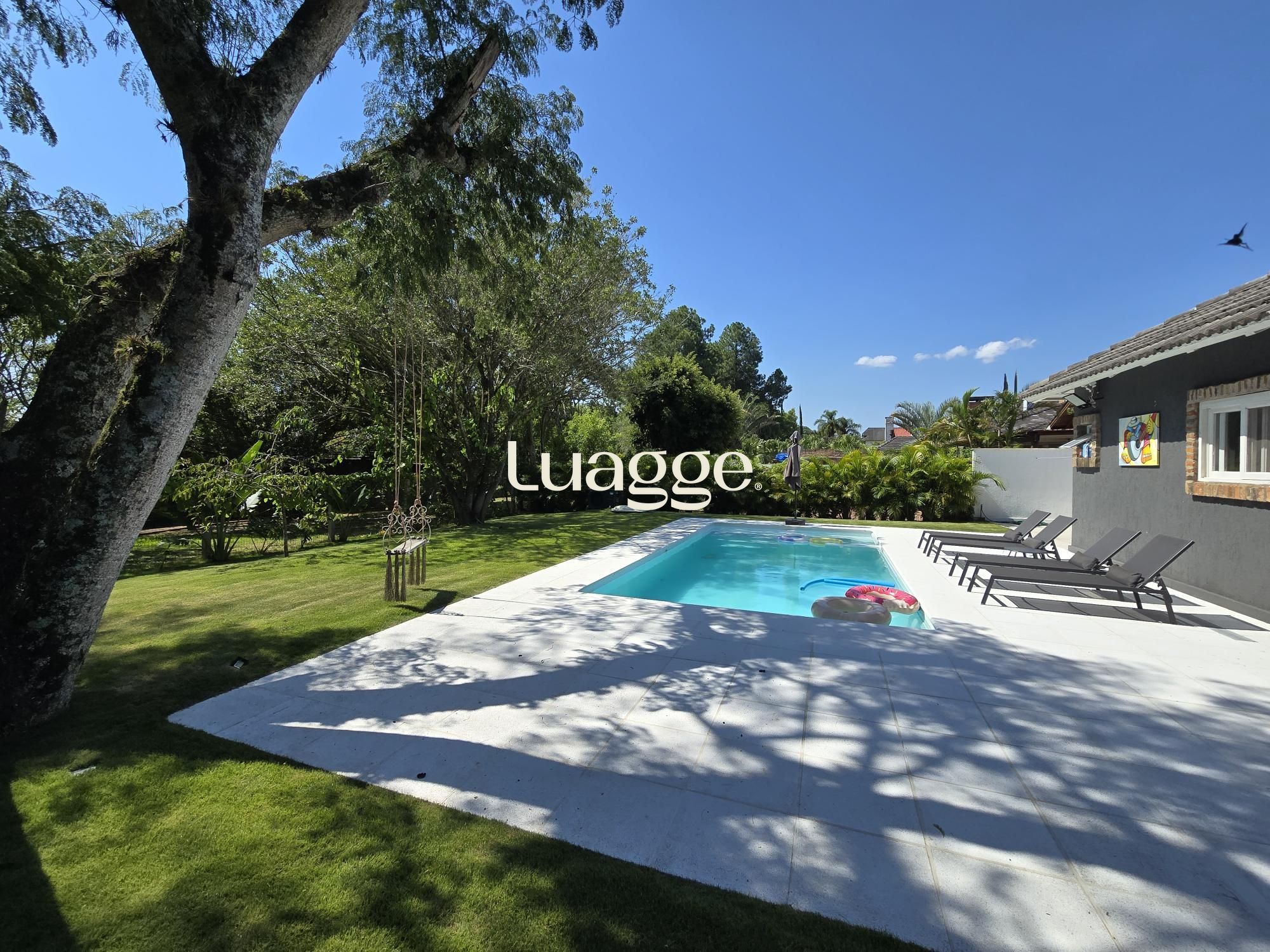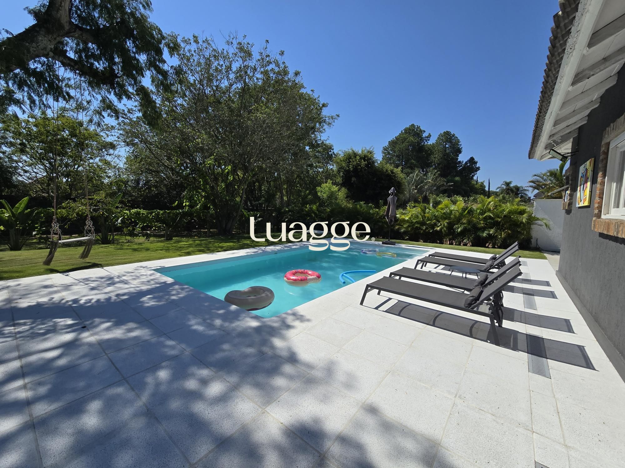 Lindo pátio com piscina aquecida e muito verde.