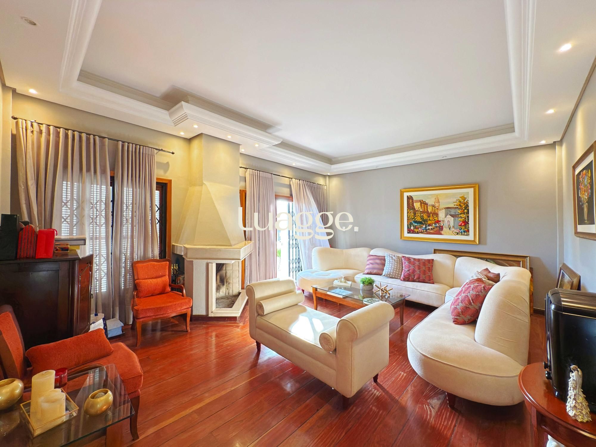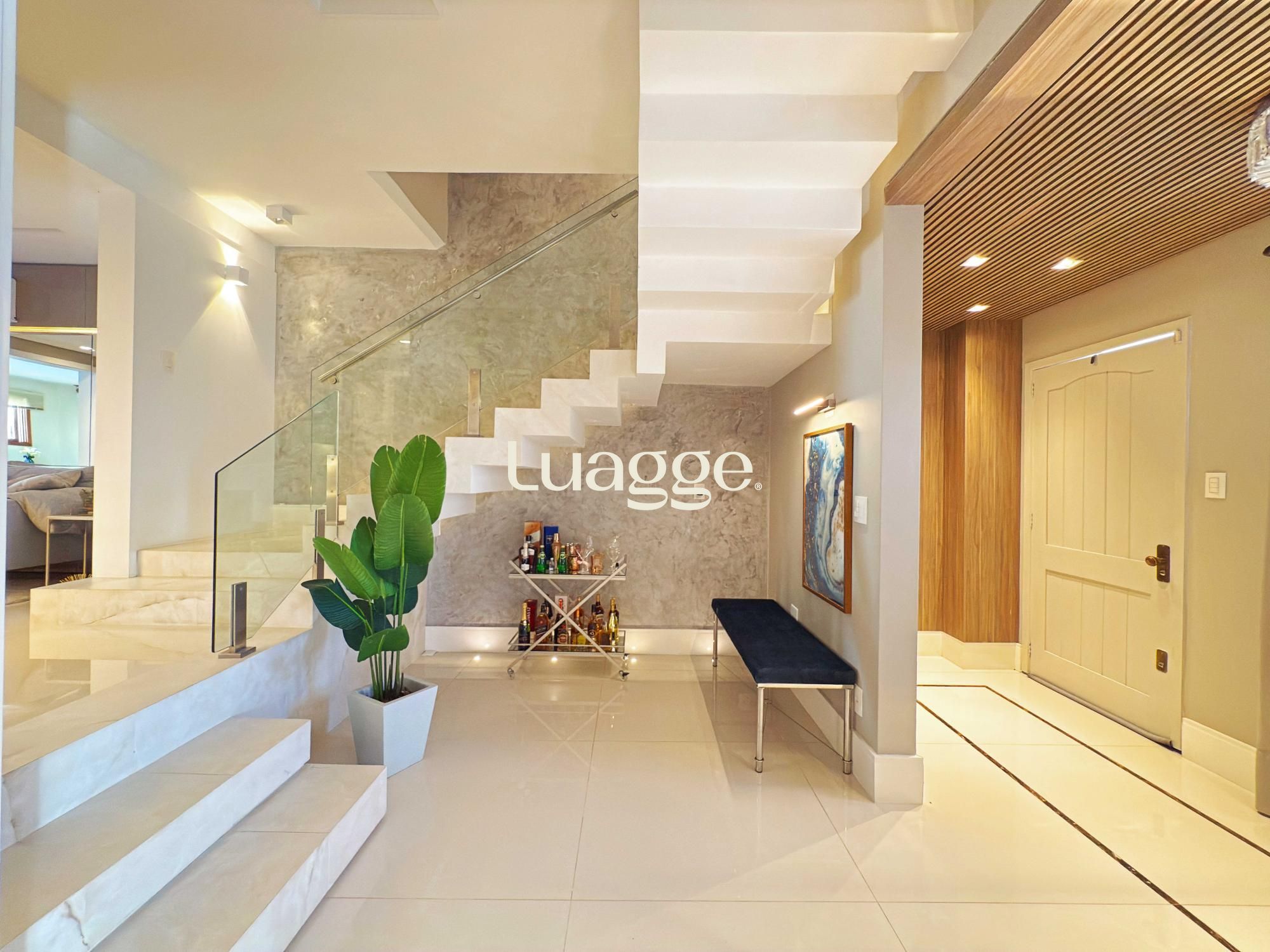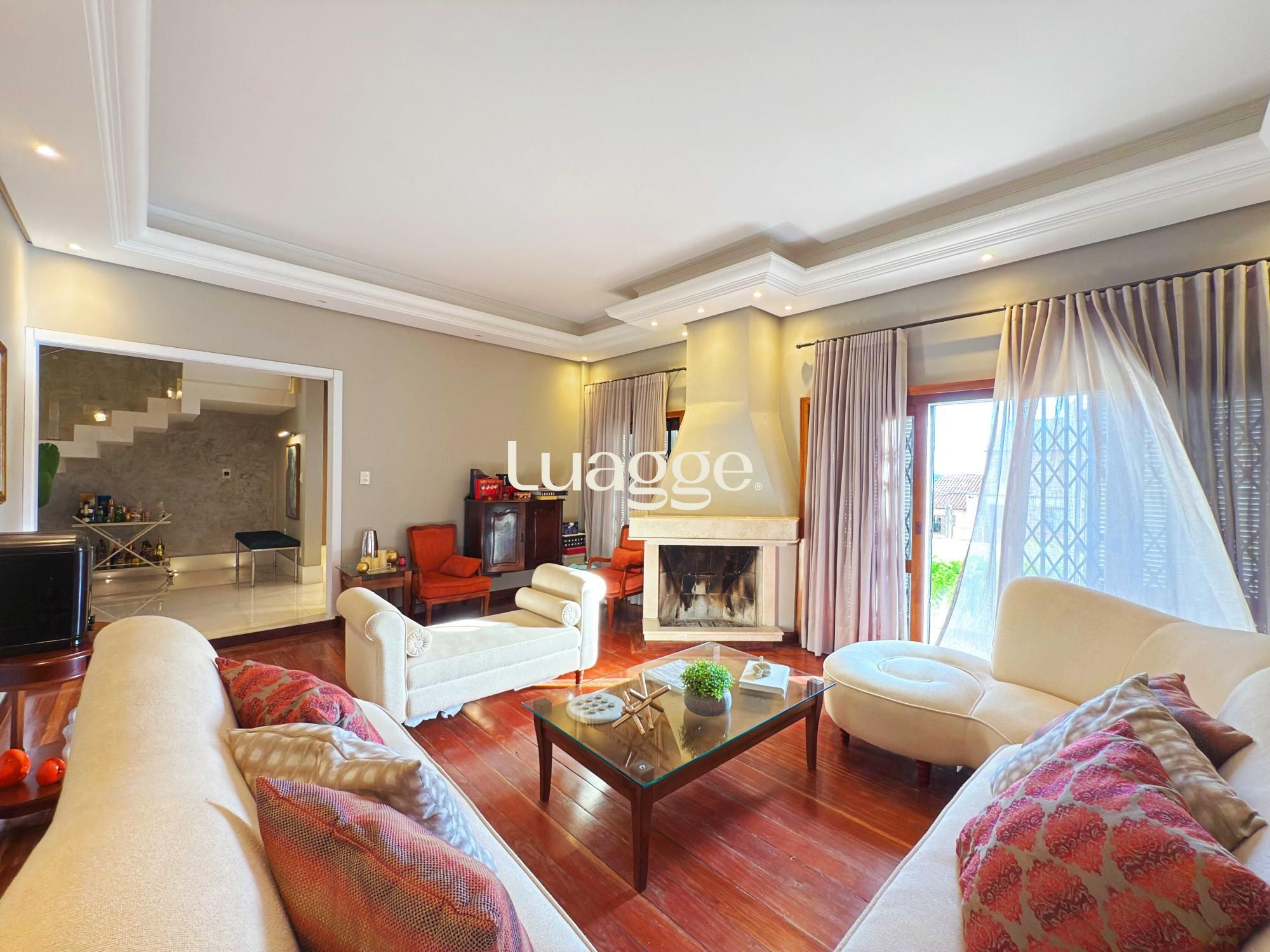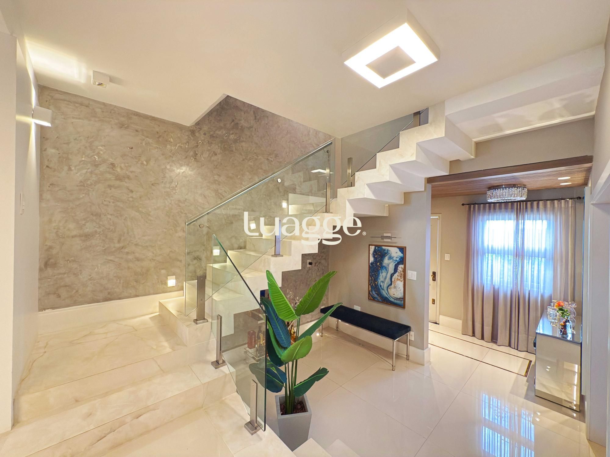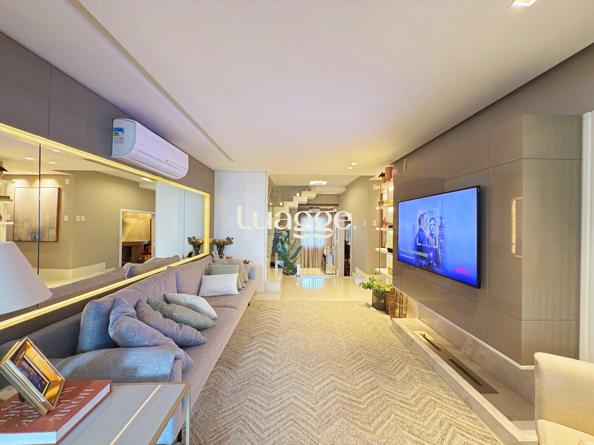 Estilo moderno com hall de entrada e piso em porcelanato, aconchegante sala de estar com lareira, sacadão, piso em madeira nobre (Ipê), sala de TV com lareira a gás e lavabo. Cozinha montada integrada com espaço gourmet, sala de jantar e ambiente de churrasqueira. Pátio ao fundo com piscina e lavanderia.