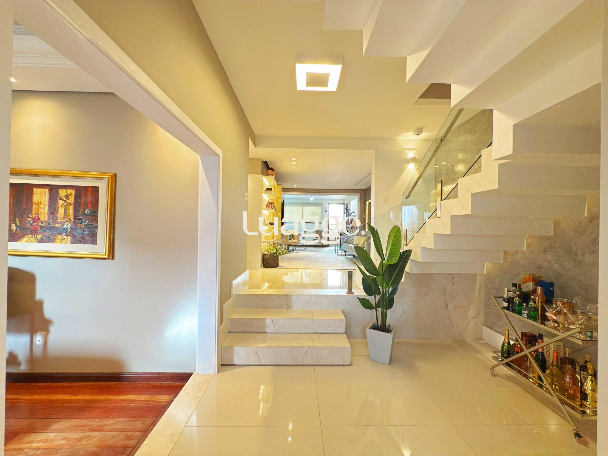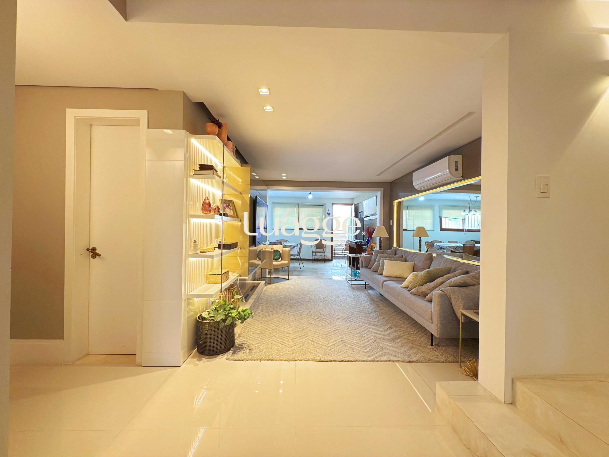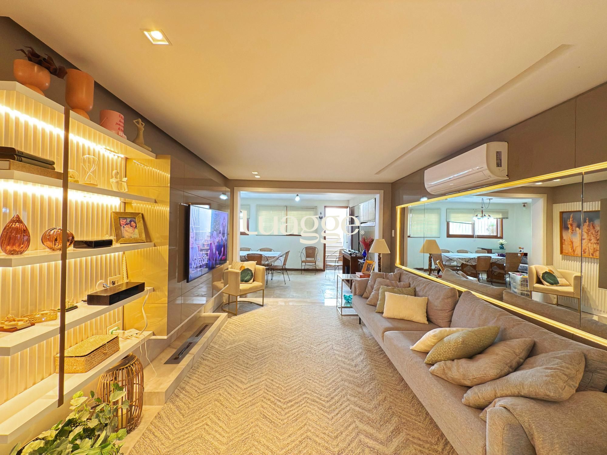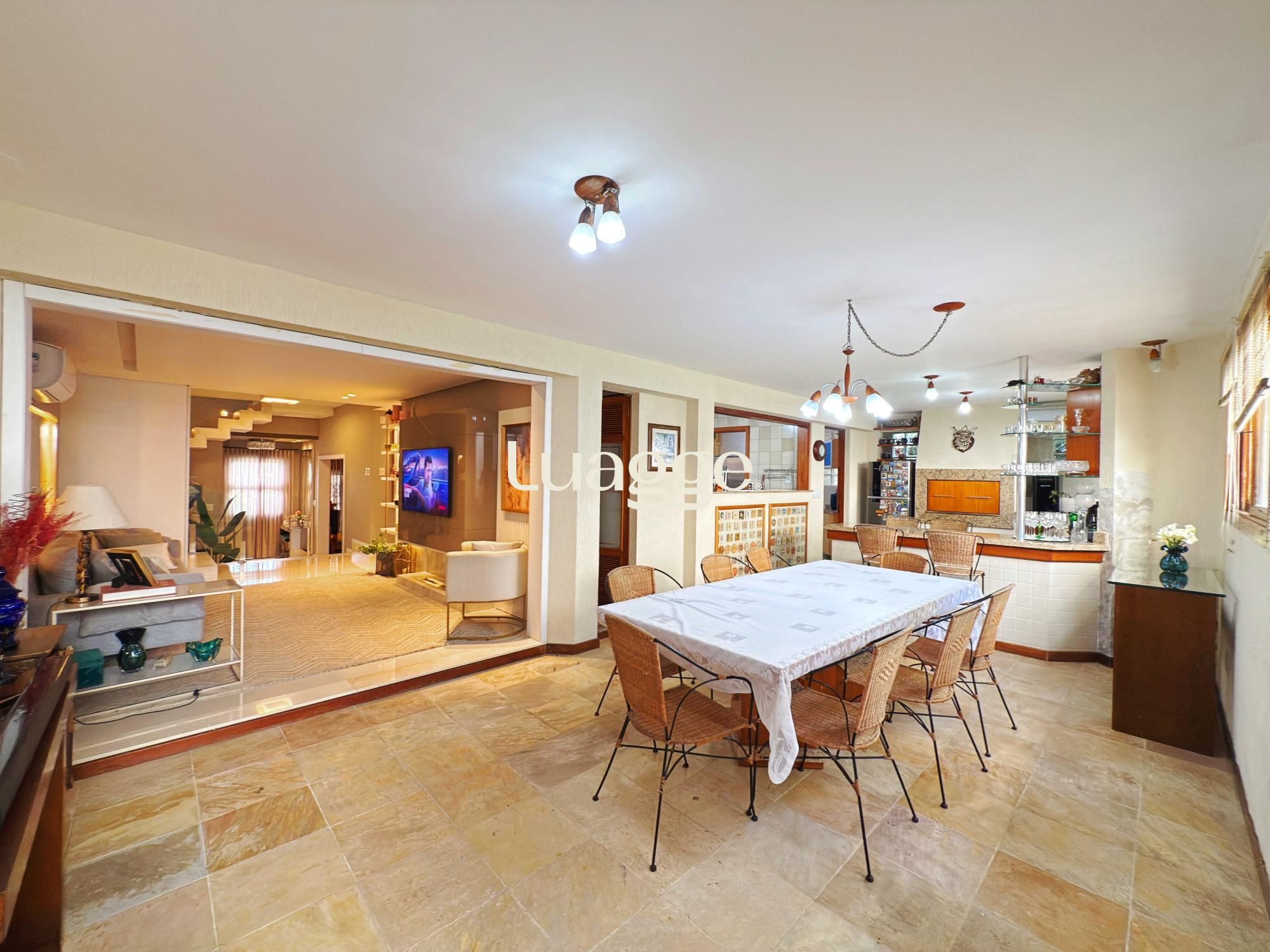 Estilo moderno com hall de entrada e piso em porcelanato, aconchegante sala de estar com lareira, sacadão, piso em madeira nobre (Ipê), sala de TV com lareira a gás e lavabo. Cozinha montada integrada com espaço gourmet, sala de jantar e ambiente de churrasqueira. Pátio ao fundo com piscina e lavanderia.