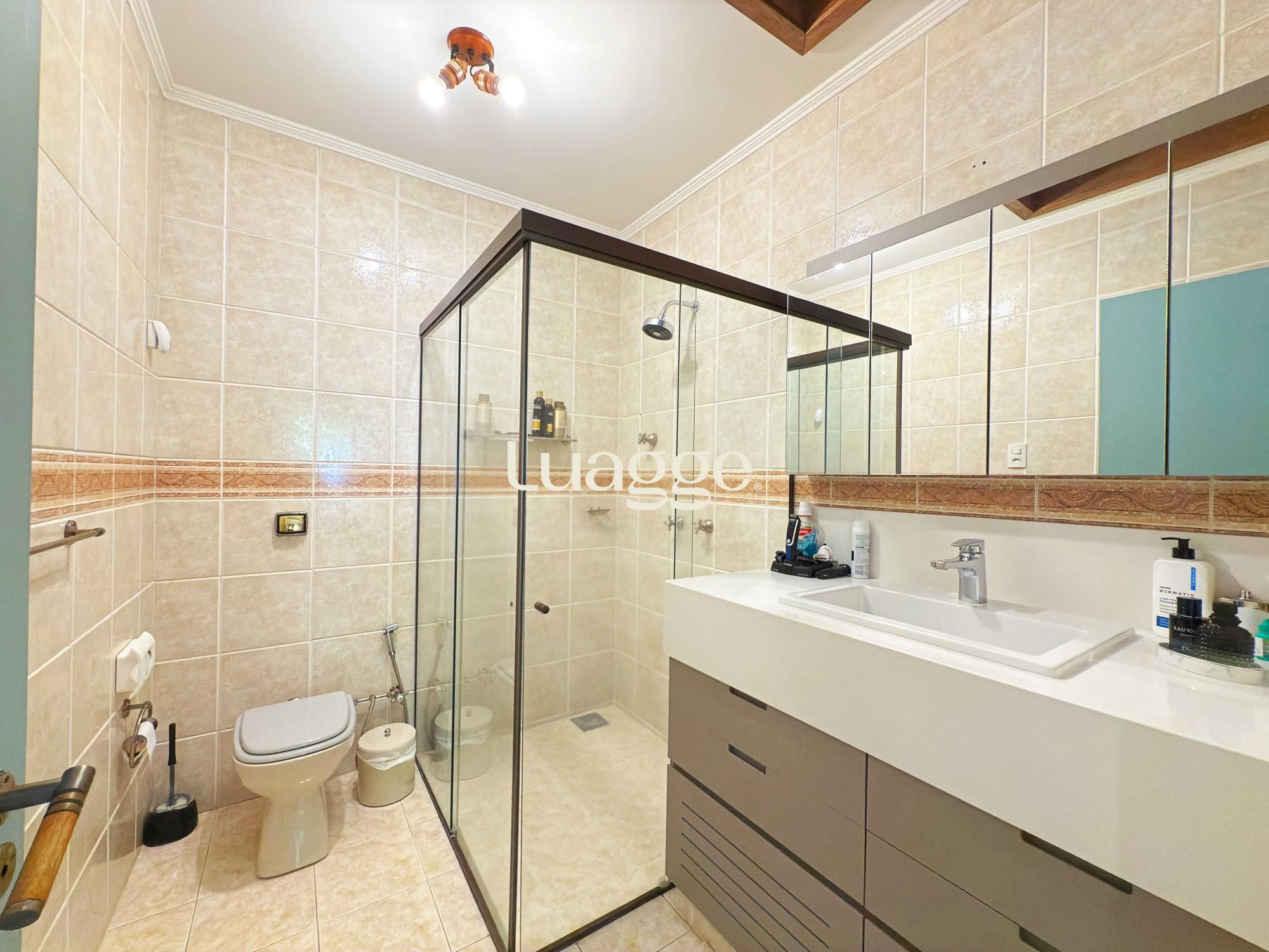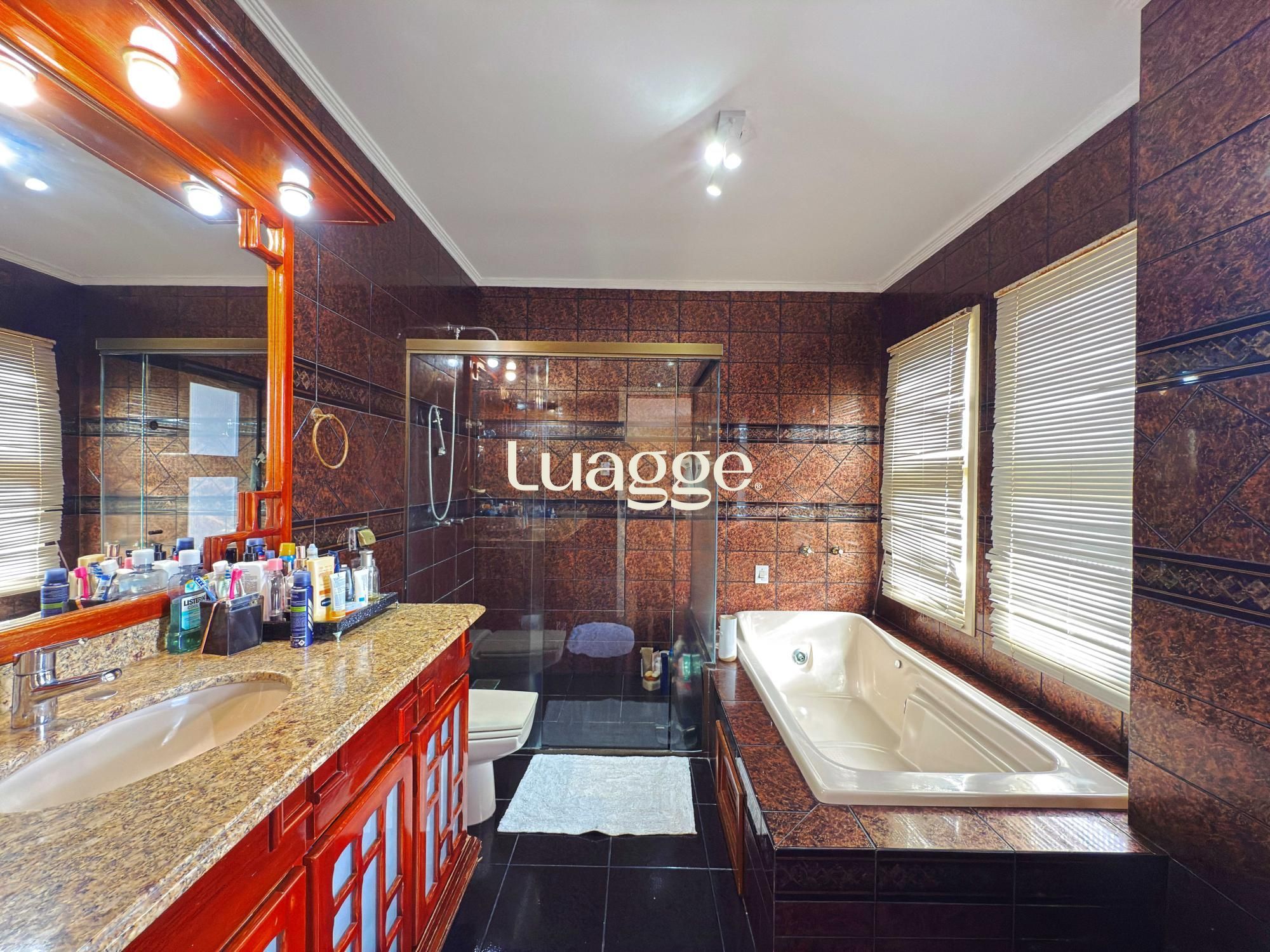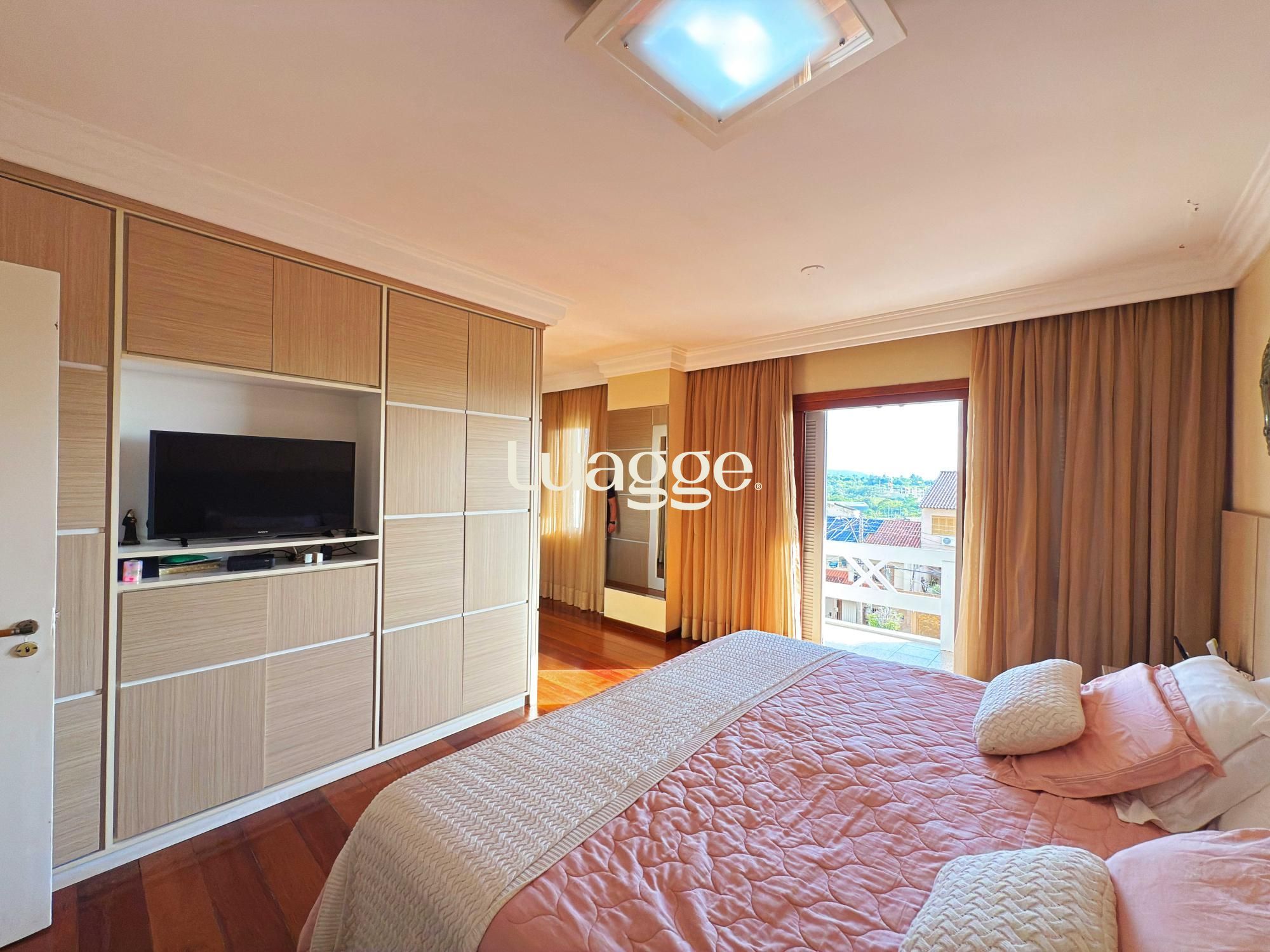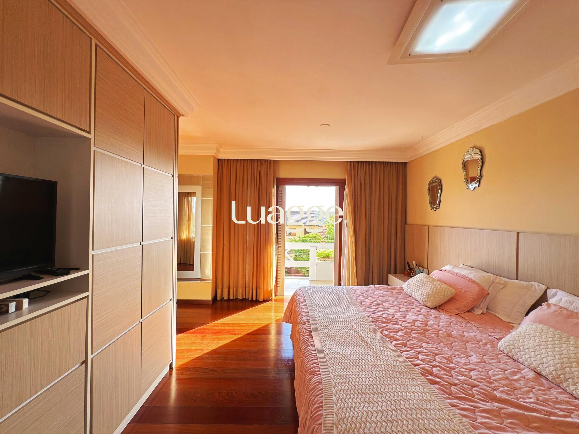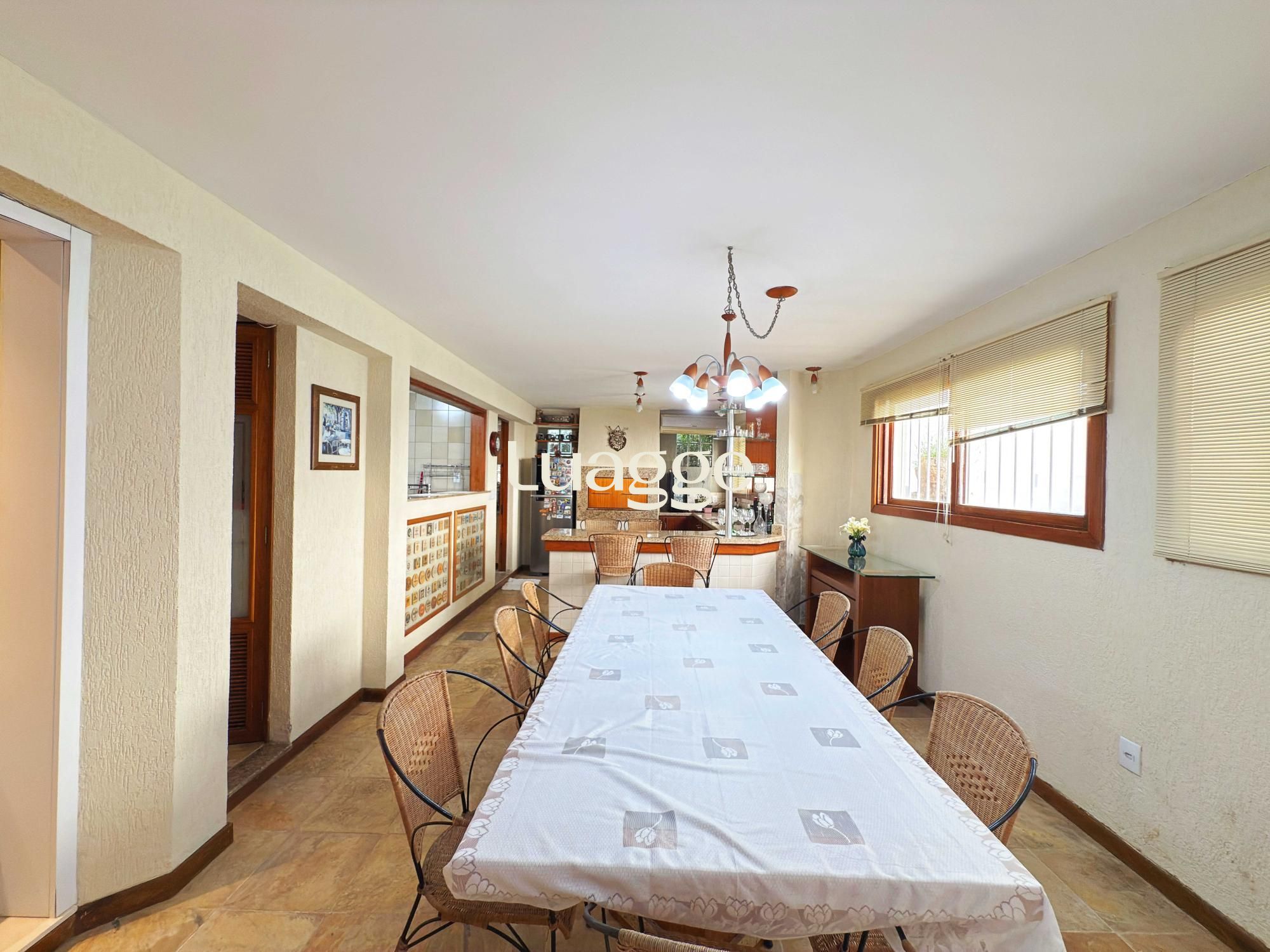 Estilo moderno com hall de entrada e piso em porcelanato, aconchegante sala de estar com lareira, sacadão, piso em madeira nobre (Ipê), sala de TV com lareira a gás e lavabo. Cozinha montada integrada com espaço gourmet, sala de jantar e ambiente de churrasqueira. Pátio ao fundo com piscina e lavanderia.