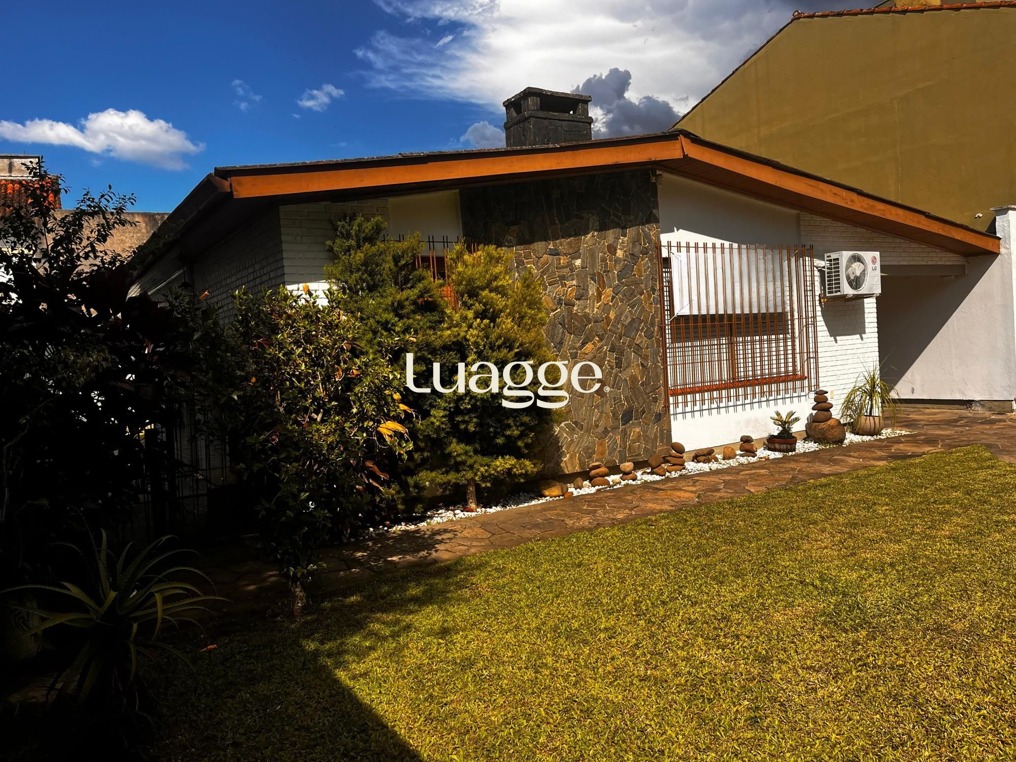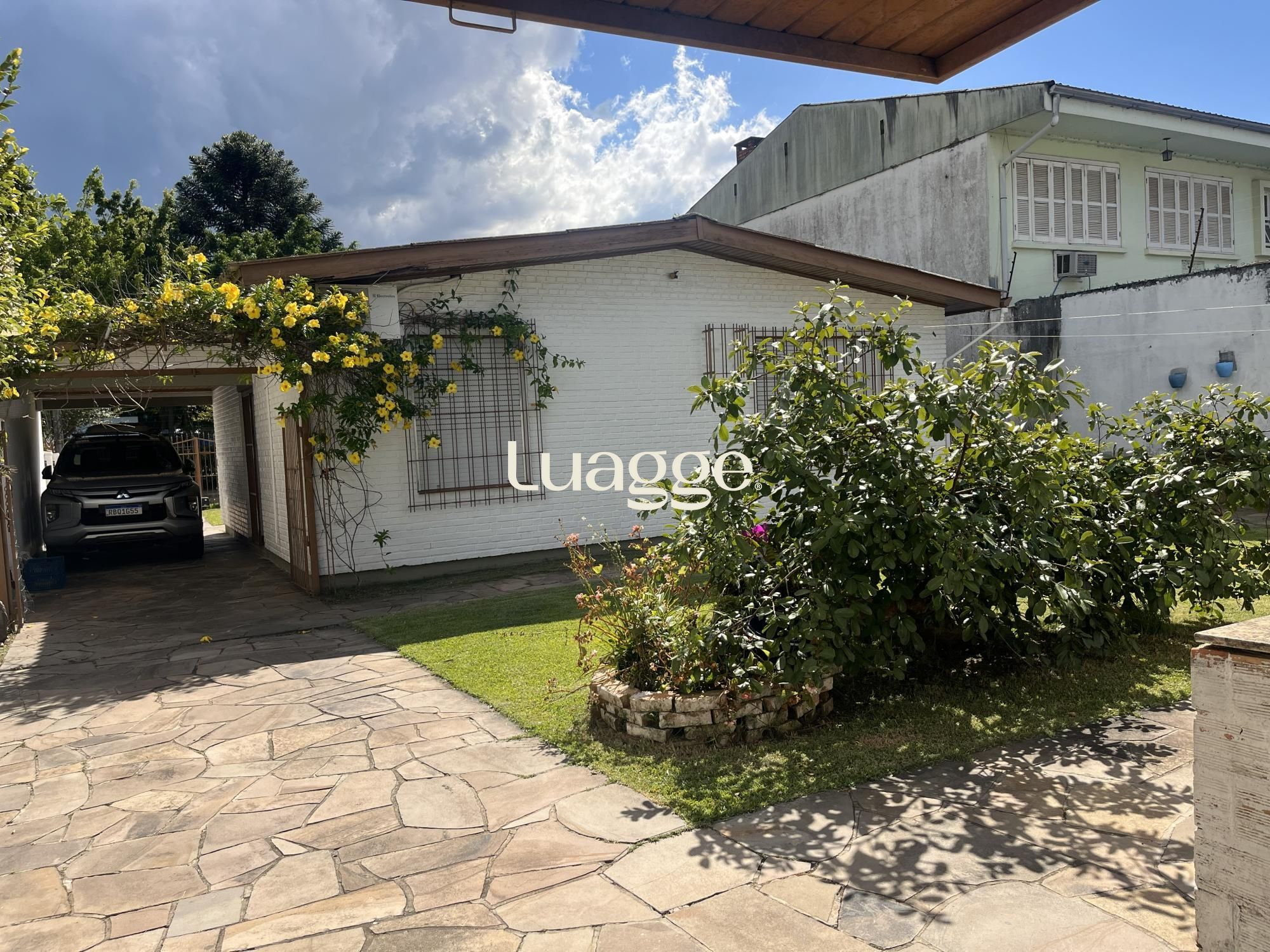Casa térrea em terreno totalmente plano, com jardim. O imóvel principal conta com 2 dormitórios, banheiro social, sala de estar e jantar integradas com espera para lareira, cozinha e área de serviço, além de 3 vagas de garagem.