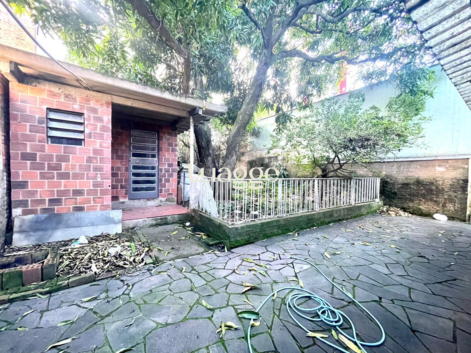 Um pátio grande com uma casa separada edícula, com coxinha e churrasqueira. Pátio grande com área verde a árvores.