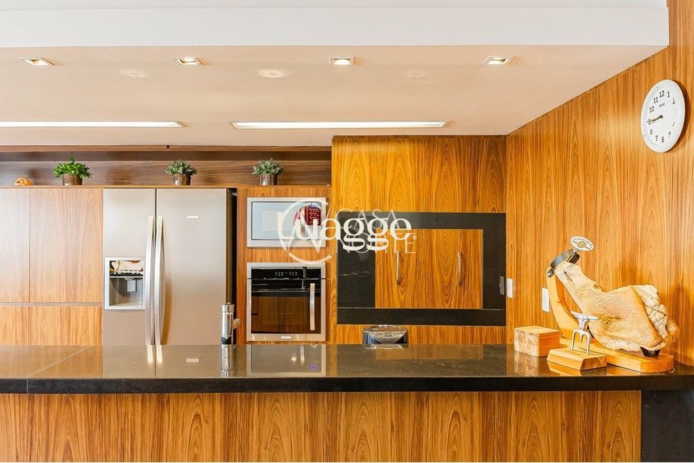 A área social se destaca pelo espaço gourmet completo, com ilha gourmet, geladeira side by side, torre quente e móveis planejados, criando um ambiente moderno e funcional. A cozinha é integrada e conta ainda com uma área de serviço separada e muito ampla.