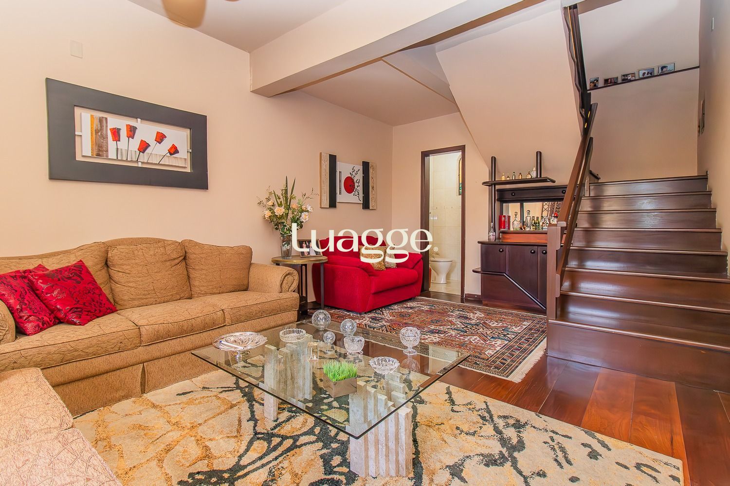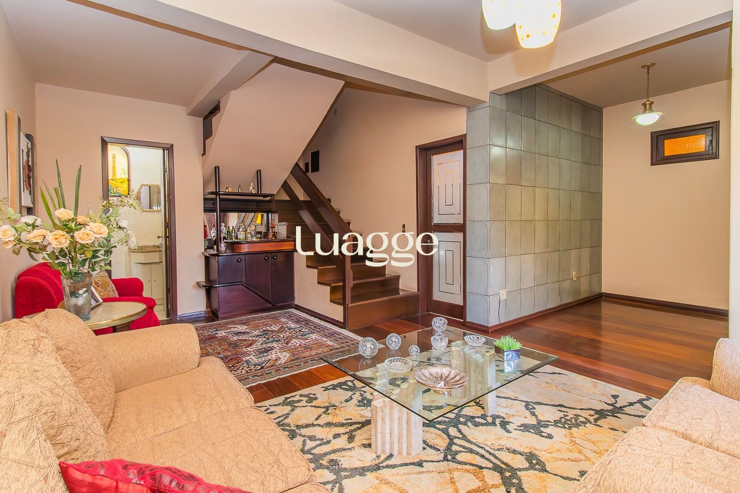 Parte Inferior : Hall de entrada, Living 3 ambientes em L todo em tabuão, Lavabo, sala de jantar, cozinha ampla e lavanderia.
