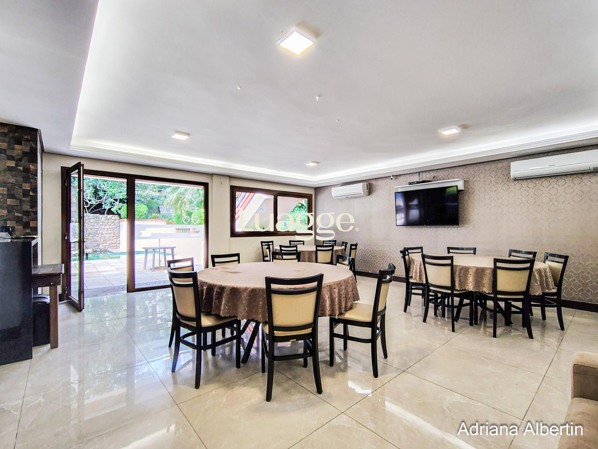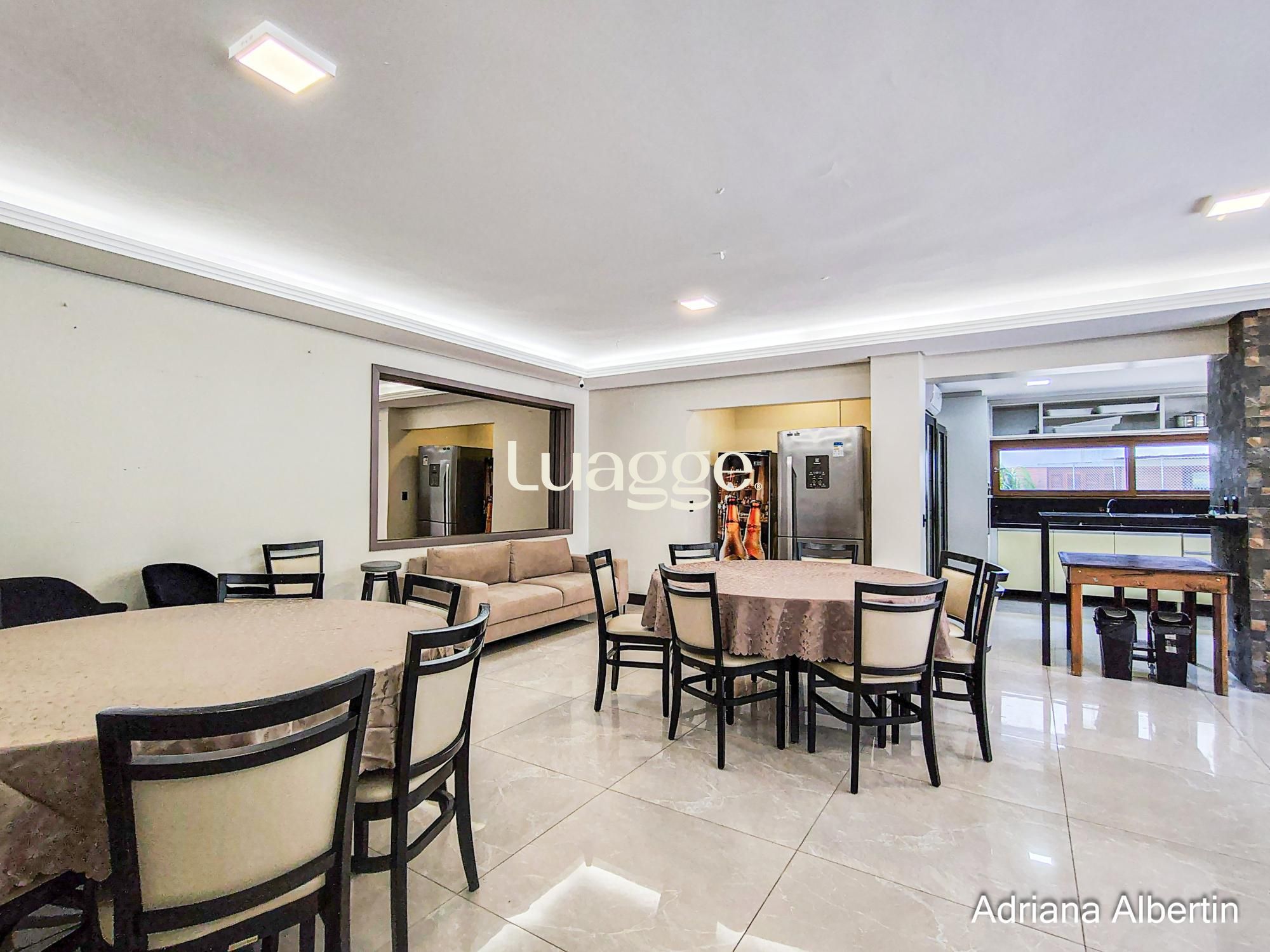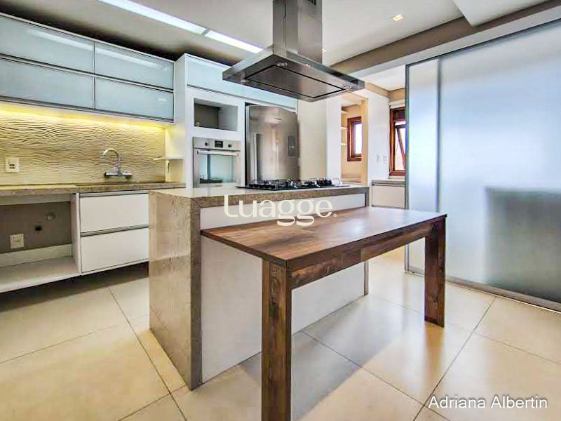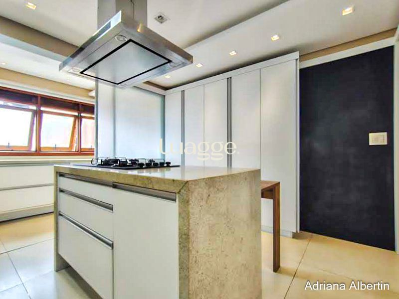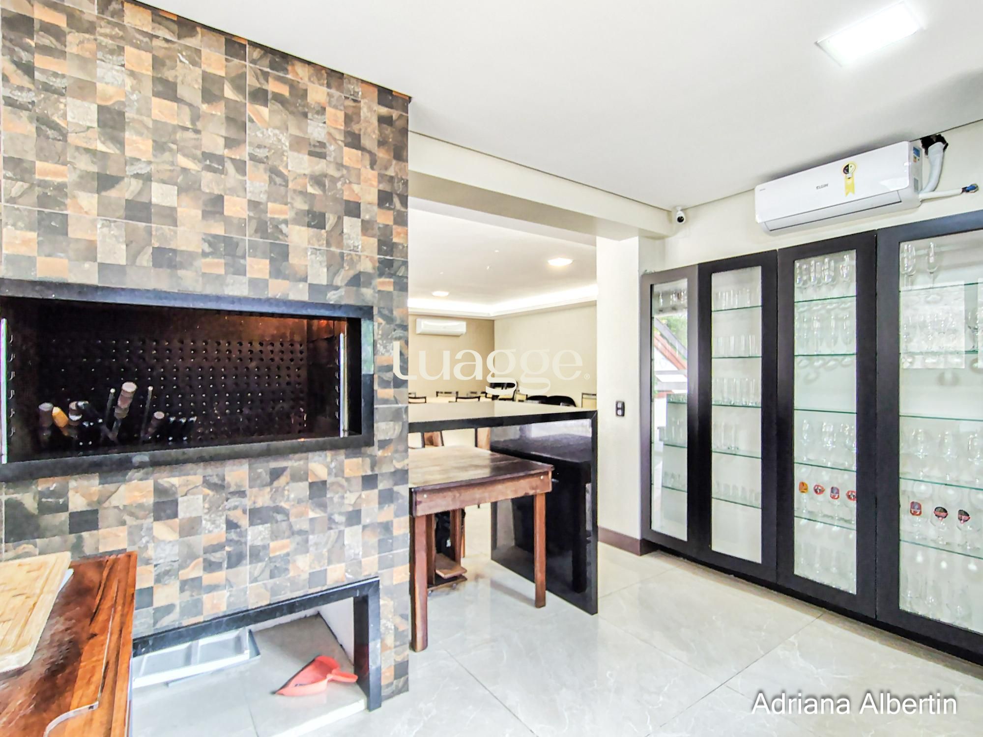 Na cobertura amplo espaço com lareira e churrasqueira integradas, terraço externo aberto e com vista para o Rio Guaíba.