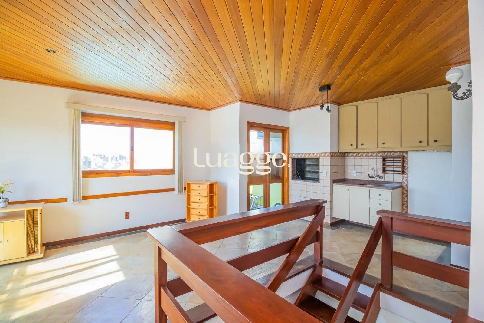 No living uma bela escada em madeira que dá acesso para o pavimento superior da cobertura, cozinha montada, integrada à copa, com churrasqueira, móveis planejados e uma área de serviço espaçosa. Com 2 vagas de garagem.