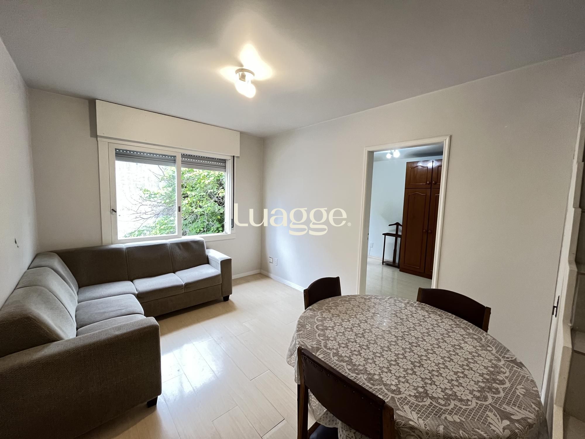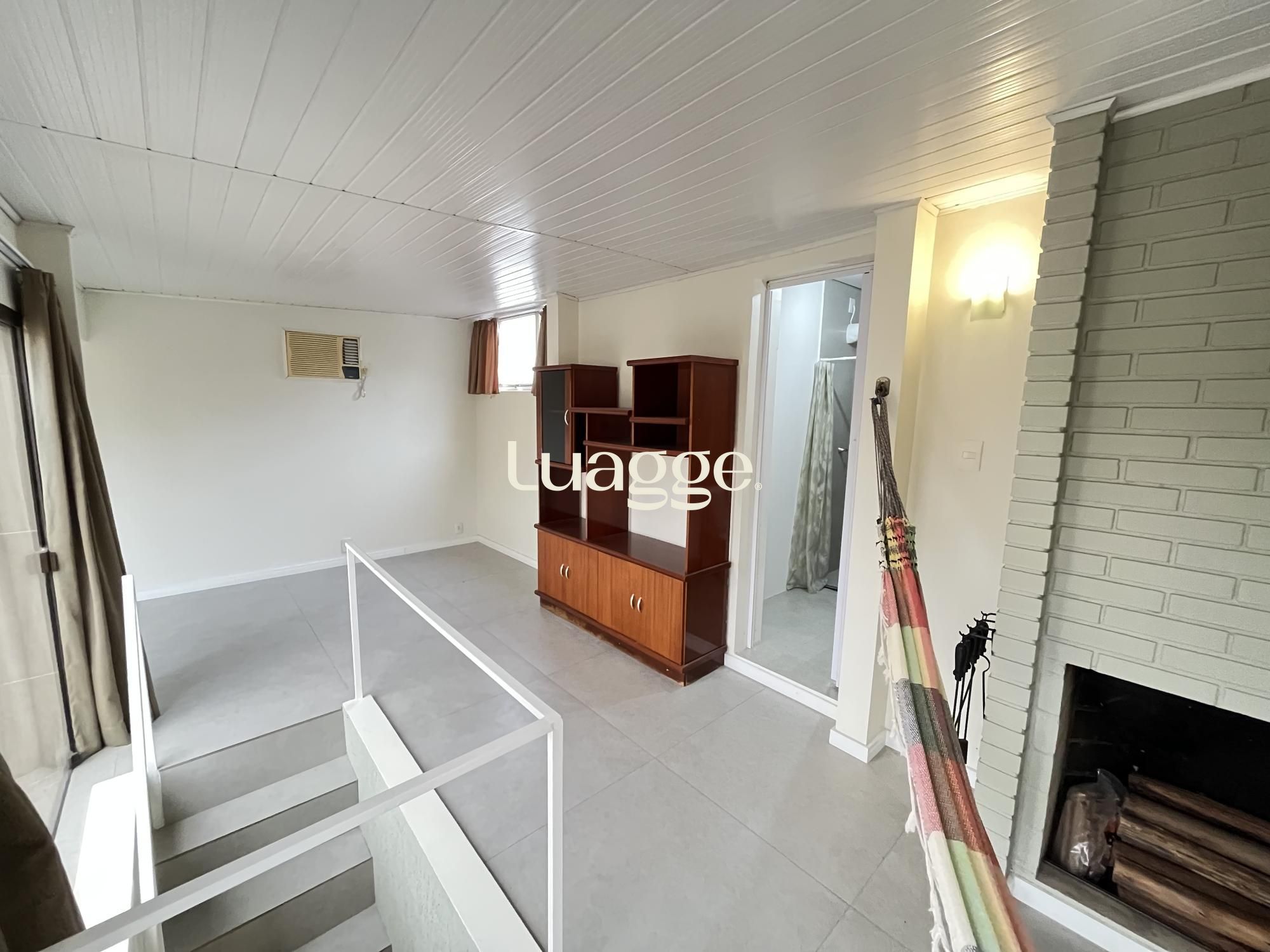 1 dormitório com suíte no piso inferior e opção do segundo dormitório, no piso superior, living com 2 ambientes, cozinha ampla com área de serviço separada. Terraço coberto em L, banheiro social, lareira e terraço aberto. Permanecem no imóvel , máquina de lavar roupas, armário multiuso, , varais, mesa em metal e tampo de granito, bancada com armário, sofá em L, roupeiro, cômoda, cadeiras com mesa da área externa, espreguiçadeira e ventilador. No piso superior um sofá cama, com cama auxiliar, prateleira/balcão, chuveiro Turbo 220, cortinas de tecido, , vasos, ar condicionado (2), 1 Split.