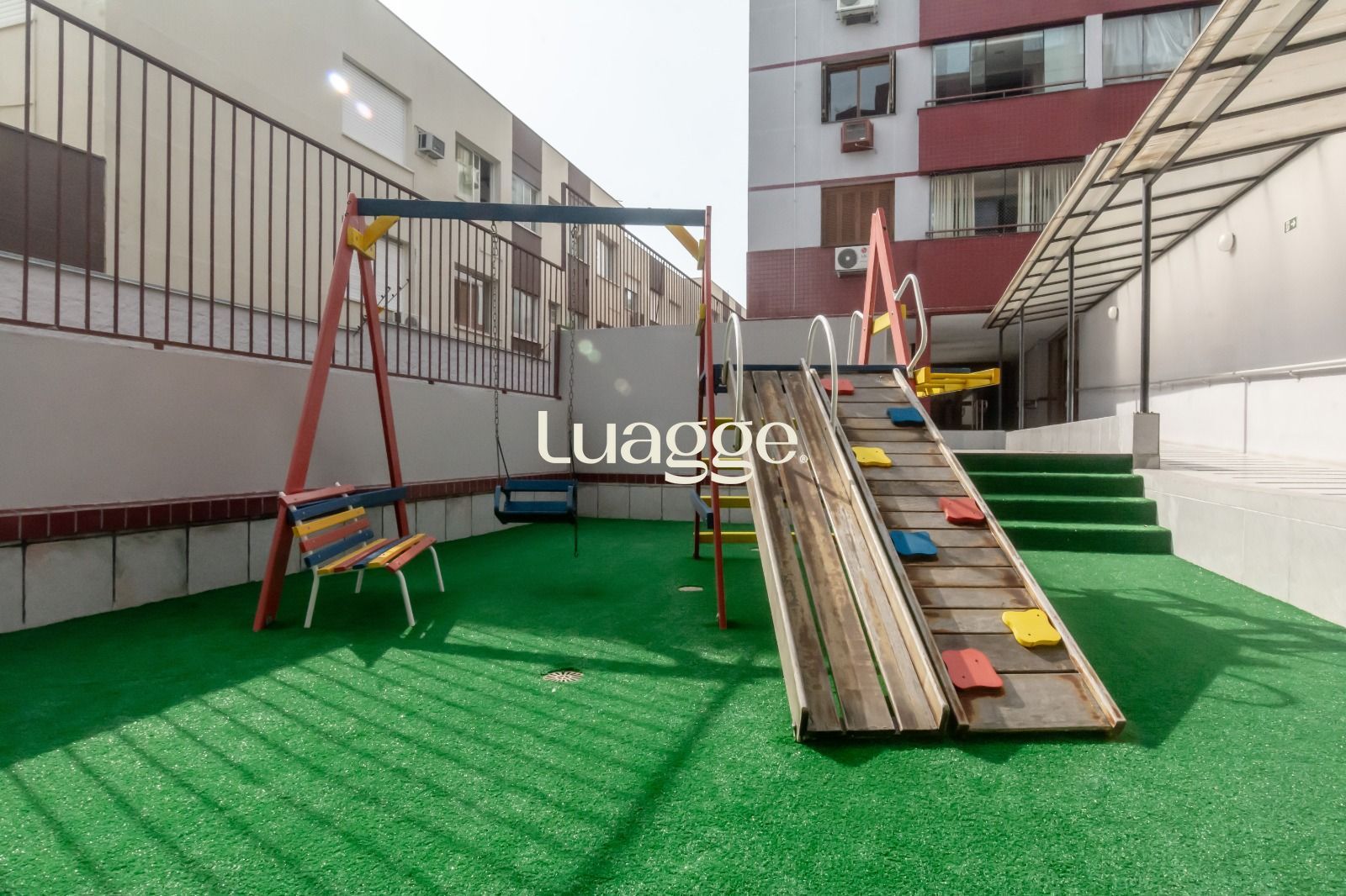 Espaço entre os blocos ajardinado tipo pracinha interna.