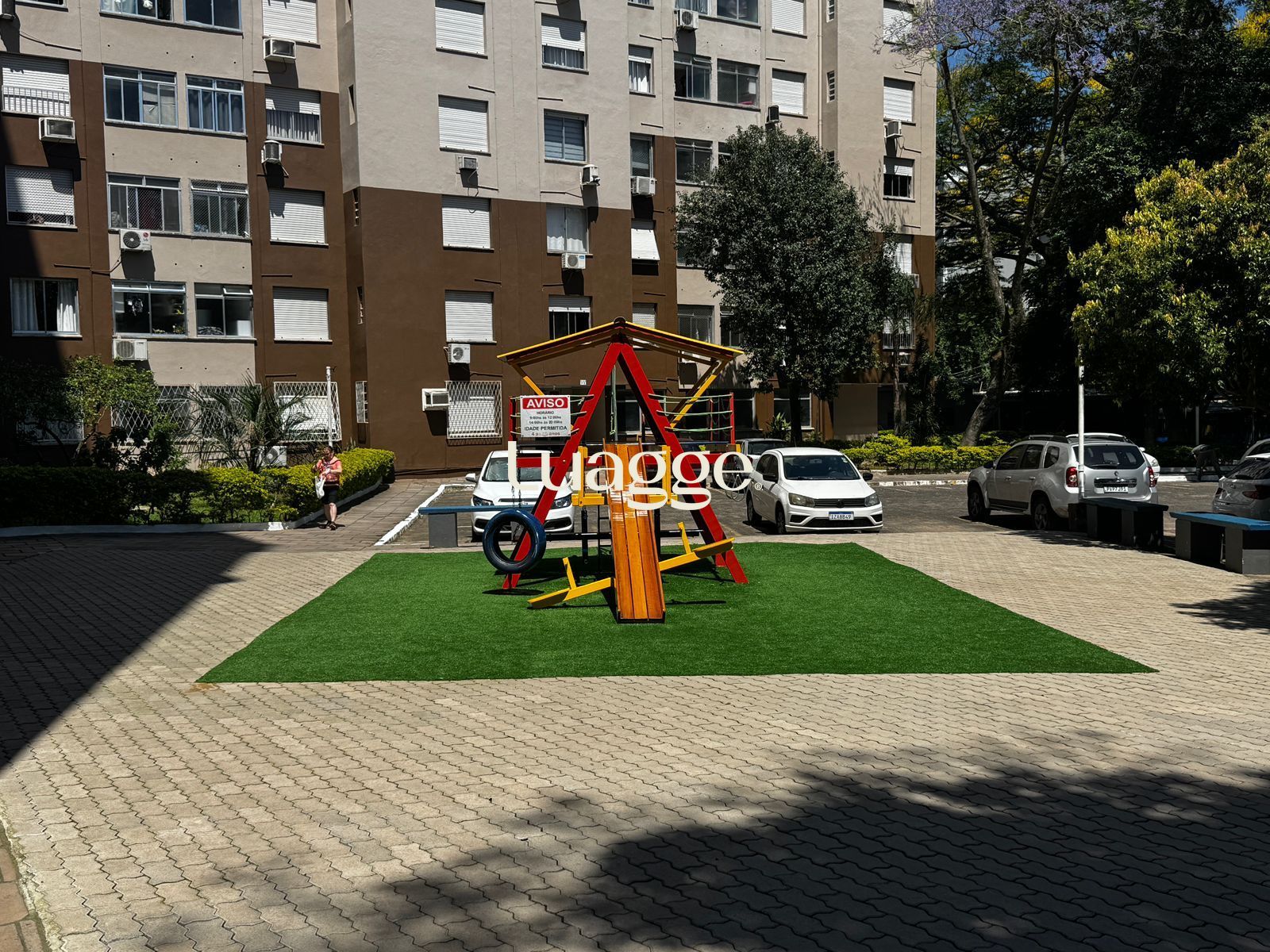 Condomínio com salão de festas, quiosque com churrasqueira, quadra de futebol, playground, prédio com elevador