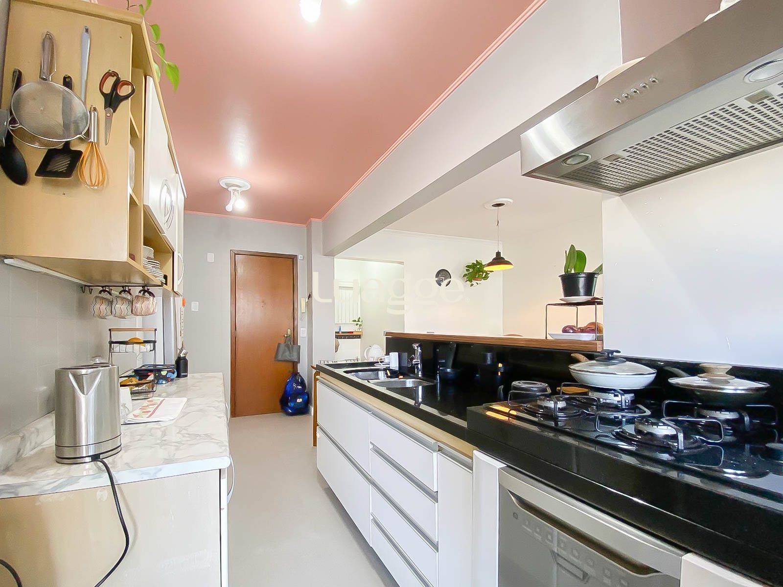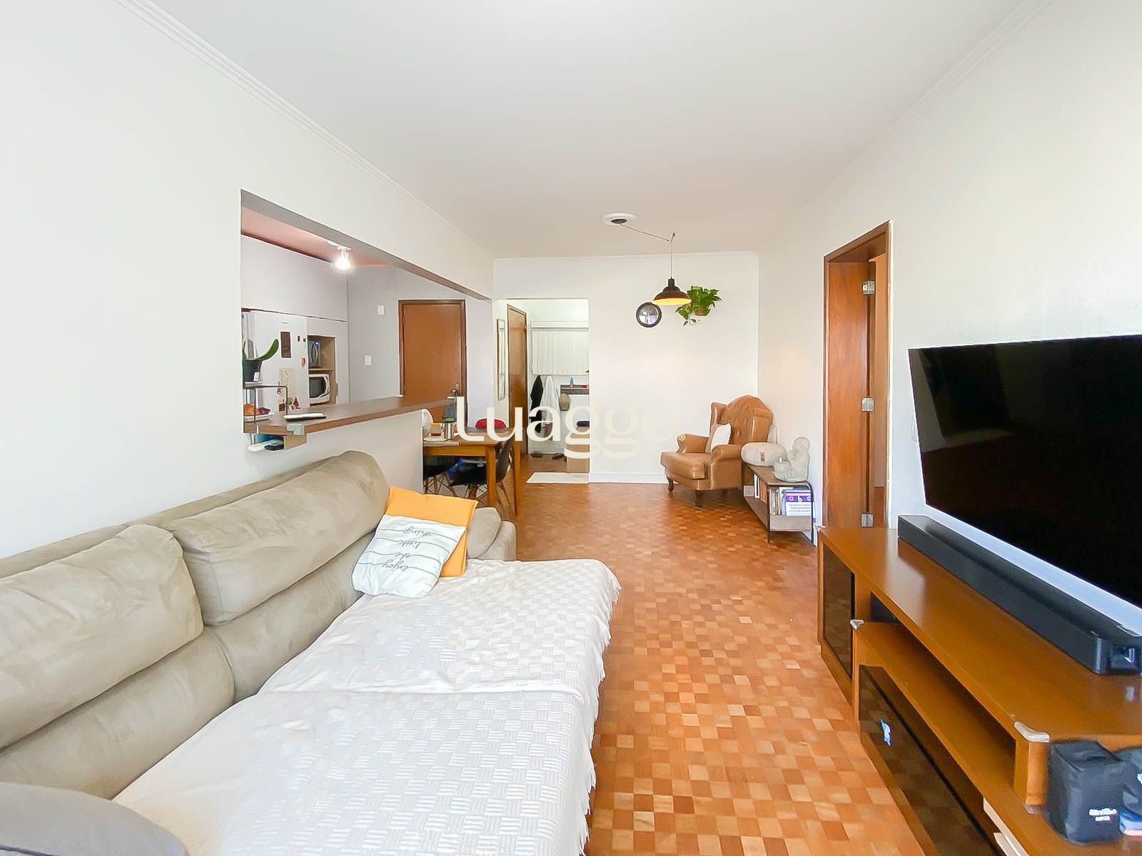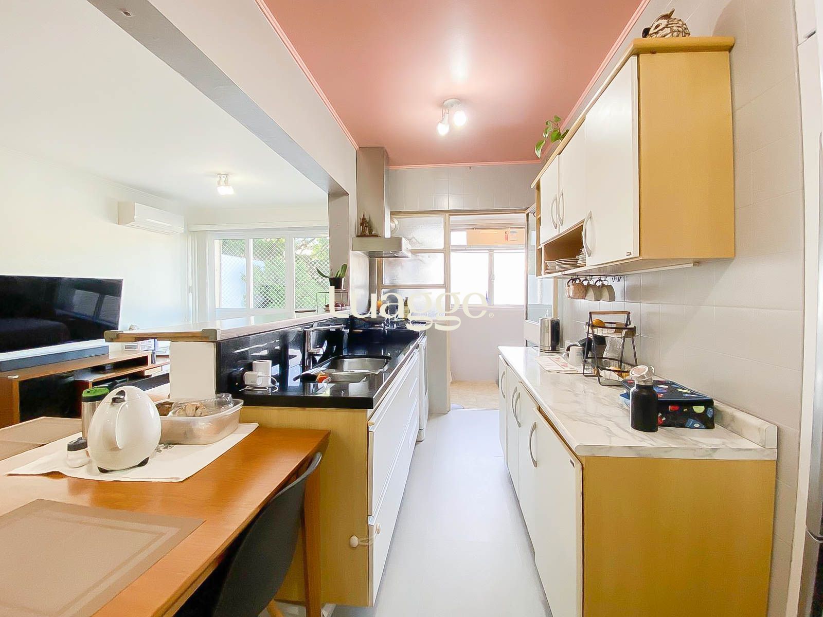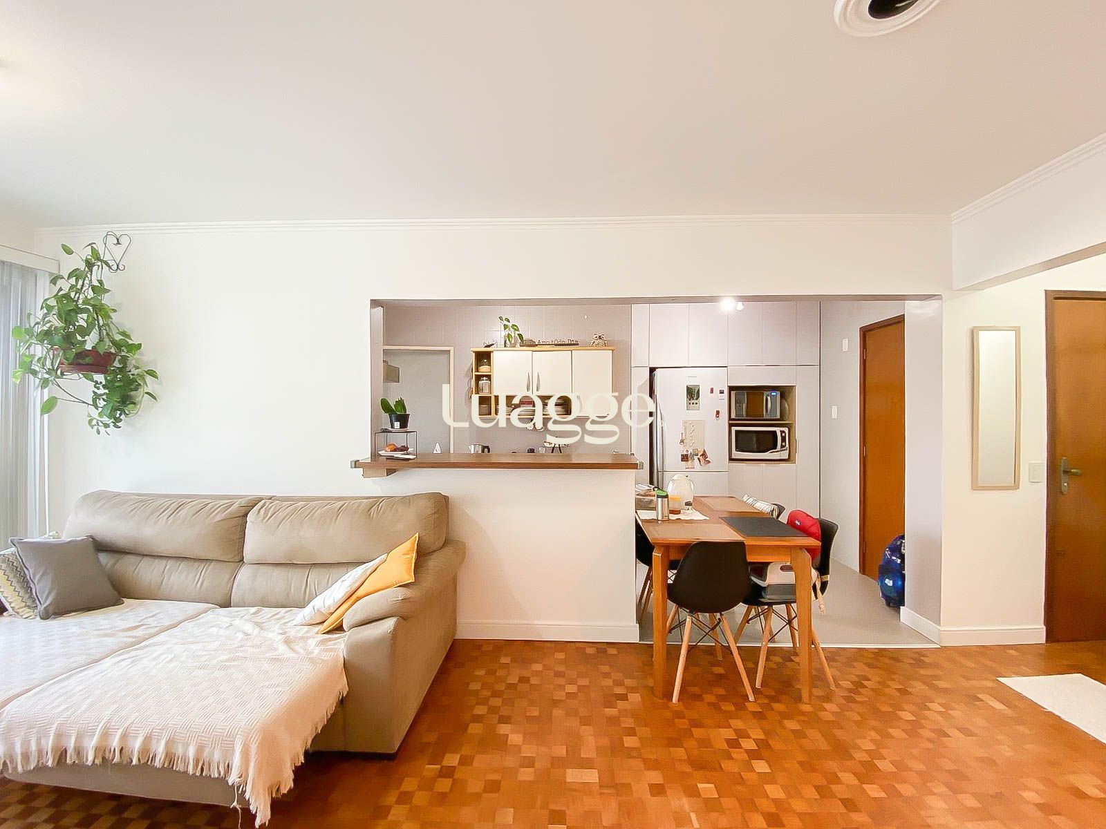 A área social conta com living amplo e bem iluminado, integrado à cozinha com móveis planejados, trazendo praticidade e ótimo aproveitamento de espaço. A cozinha é completa, com boa circulação e acesso à área de serviço separada.